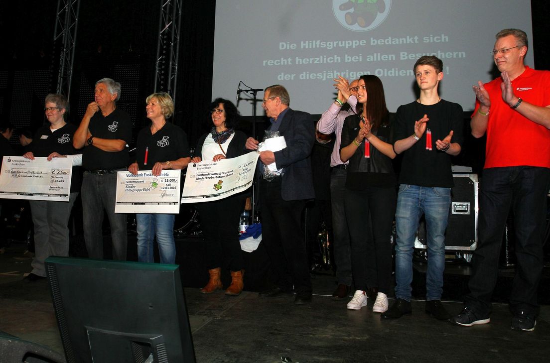 Mit der gespendeten Summe finanziert die Hilfsgruppe seit Jahren zwei ambulante Krankenschwestern, die den krebskranken Kindern und ihren Familien in ihren gewohnten Wohnräumen unterstützend zur Seite stehen. Über Sponsoren hatte die Hilfsgruppe einen Scheck über 30.000 Euro zusammen bekommen. Am Abend der Oldienacht kamen noch 15.000 Euro vom REWE-Center in Kall und 2.500 Euro der Kreissparkasse Euskirchen dazu. Seit Beginn ihres Engagements hat die Hilfsgruppe Eifel rund 870.000 Euro an die Kinderkrebsstation der Uniklink Bonn überwiesen. „Der Willi würde sich wünschen, dass wir bis zur nächsten Oldienacht im April 2017 die Millionenmarke knacken würden“, meinte Moderator Tom Sauer.