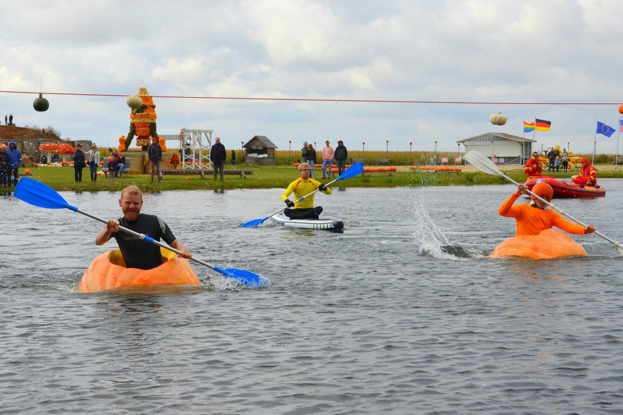 Die „Kürbisregatta“ wird in ausgehöhlten Riesenkürbissen durchgeführt. Nur mit einem Paddel müssen die wagemutigen Kürbis-Kapitäne die riesige Frucht auf Kurs halten. Hierbei sind Konzentration, Gleichgewichtssinn und Kraft gefragt, um als erster ans Ziel der 35 Meter langen Strecke über den Krewelshofer See zu gelangen.