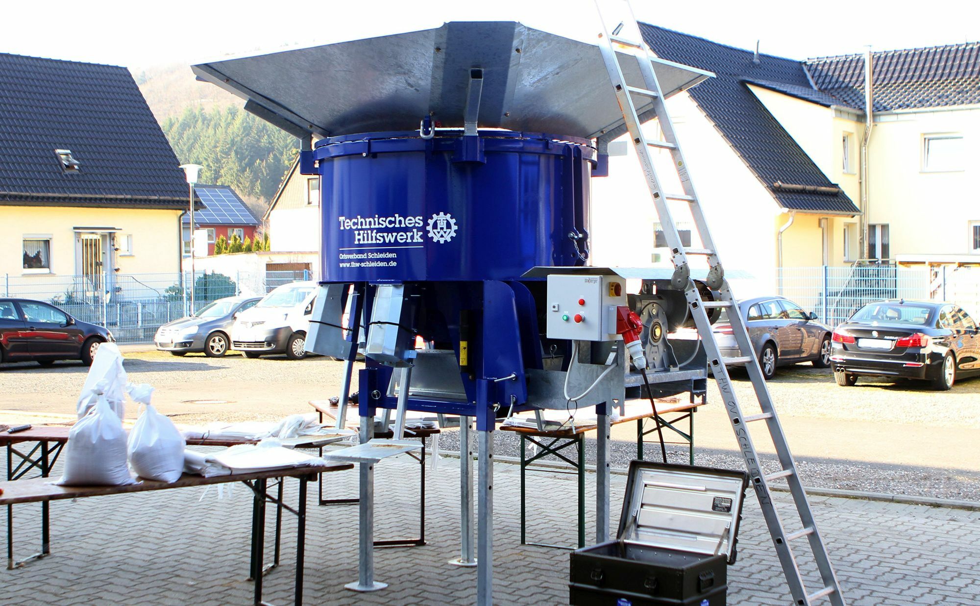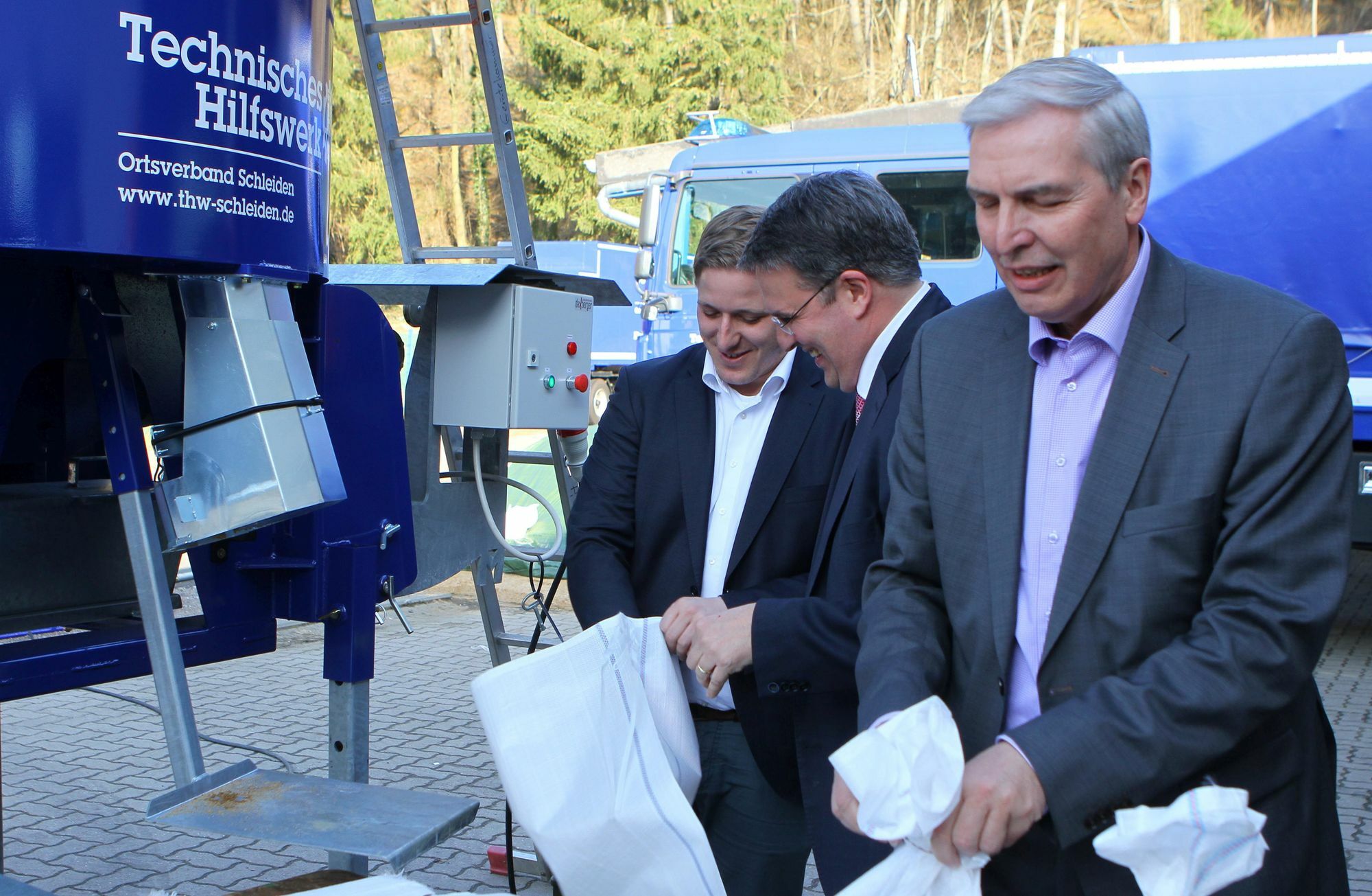 Für die Männer des THW Schleiden ist die neue Sandsackabfüllmaschine schon eine enorme Erleichterung. »Früher haben wir die Sandsäcke mit einem Trichter per Hand abgefüllt. Dabei haben wir für 1.800 Säcke rund sechs bis sieben Stunden gebraucht«, erklärt Zugführer Sven Köhnen. Mit dem neuen 9,5 kW starken Gerät geht es deutlich schneller. Dazu benötigt man eine Person an je einer der fünf Befüllungs-Stationen, zusätzlich je Station zwei Personen, welche die Säcke zumachen und weitere Personen, die sie abtransportiert. Also sind rund zwanzig Mann damit beschäftigt, um rund 3.000 Säcke (jeder rund 20 Kilo schwer) in einer Stunde zu befüllen. Neben dem Elektronantrieb durch ein Notstromaggregat kann die Befüllmaschine auch über die Zapfwelle eines Traktors angetrieben werden. Damit ist sie überall einsetzbar, denn sie kann nicht nur stationär in Schleiden betrieben werden, sondern überall dort, wo sie benötigt wird. Alleinstellung Im Kreis Euskirchen hat das Gerät eine Alleinstellung: »Es gibt nur unsere Befüllmaschine im Kreis Euskirchen«, erklärt Sven Köhnen. Auch im Land Nordrhein-Westfalen ist der Schleidener Sandsack-Abfüllmischer, so die offizielle Bezeichnung, einer von lediglich drei Stück. Die anderen beiden stehen in Wesel und in Mülheim an der Ruhr. Hochwasser Ihren letzten Einsatz ohne die hochmoderne Technik hatten das Schleidener THW bei den Hochwasserkatastrophen in Kommern und Scheven im vergangen Jahr. Um die Anschaffung möglich zu machen, beteiligte sich die Kreissparkasse Euskirchen mit ihrer Bürgerstiftung mit einer Spende in Höhe von 7.500 Euro an den Kosten. Zur Vorstellung des Geräts waren Udo Becker, Vorstandsvorsitzender der KSK, und Markus Ramers, Vorsitzender der KSK-Bürgerstiftung, der Einladung von Bürgermeister Udo Meister gefolgt und in das THW-Gebäude an der Weierstraße gekommen. Bei der Vorstellung durch die THW-Mitglieder packten Becker, Ramers und auch Meister natürlich mit an. Text und Fotos: Paul Düster