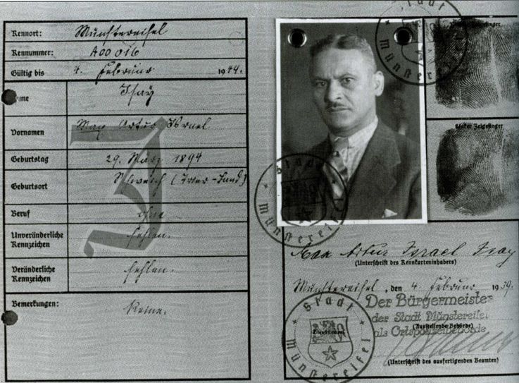 Die Kennkartenpflicht bestand seit dem 1. Oktober 1938. Die Kennkarten der deutschen Juden waren durch ein J besonders gekennzeichnet. Eine weitere Stigmatisierung erfolgte durch den Zwang, einen weiteren Vornamen führen zu müssen: Die Frauen mosaischen Glaubens mussten sich zusätzlich „Sara“, die Männer zusätzlich „Israel“ nennen lassen.