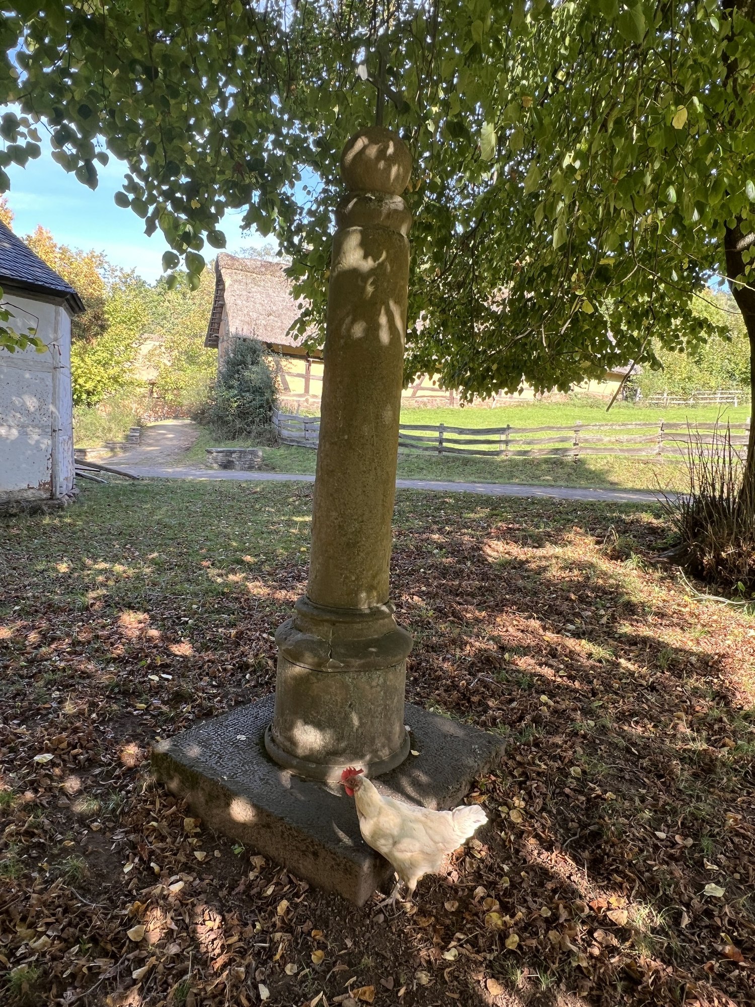 Das Originalstück stammt vermutlich aus dem 17. Jahrhundert und stand über Jahrhunderte im alten Amt Kommern. Vorwig: »Als das Original aus dem Ort weichen musste, fand es hier im Freilichtmuseum seinen neuen Platz – restauriert und eingebettet zwischen Kapelle und Schuldheißenhaus, also dort, wo weltliche und kirchliche Macht im dörflichen Leben zusammenkamen.«