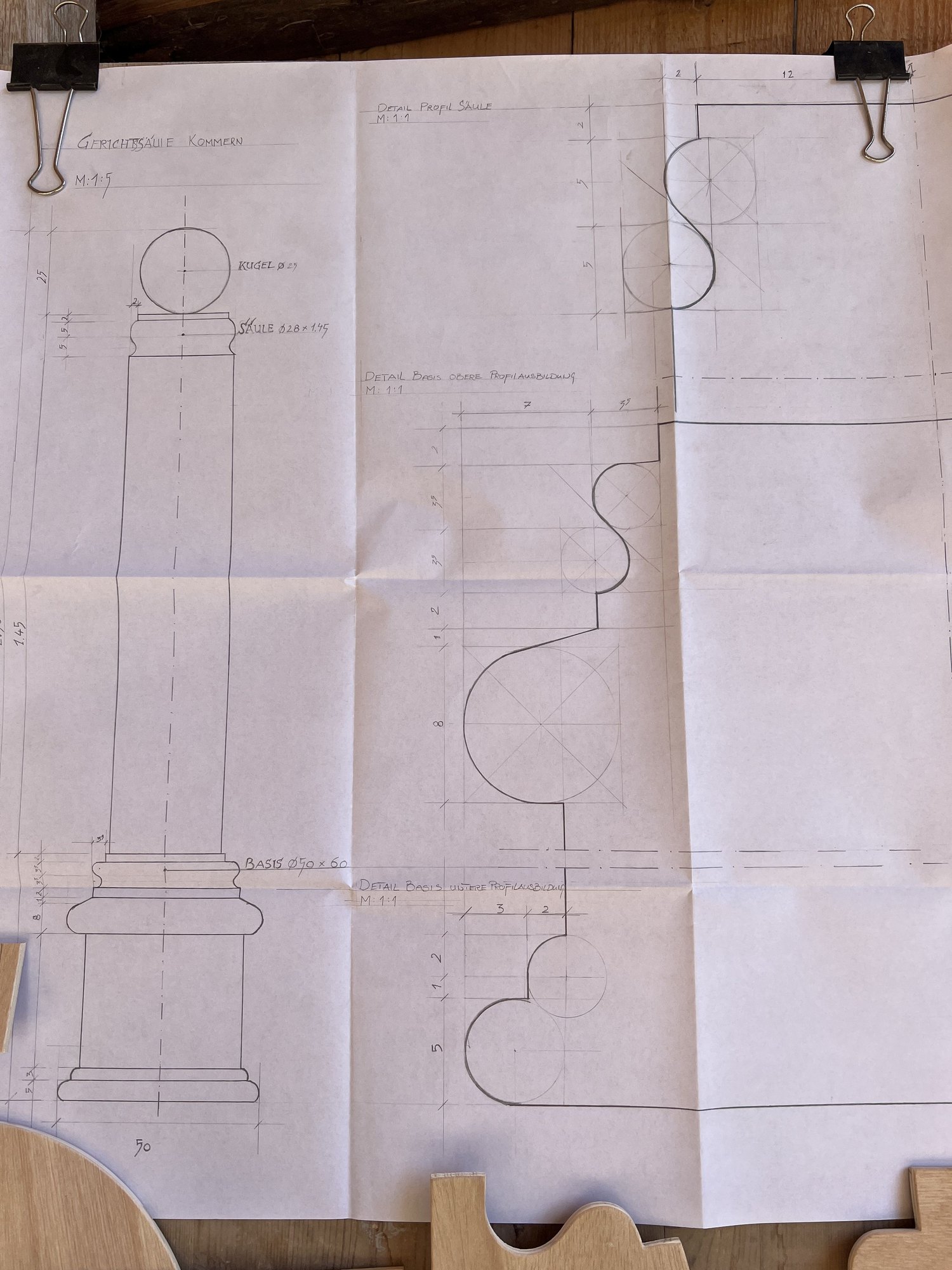 Glaubitz fertigt die Kopie aus regionalem Eifeler Sandstein aus Bitburg – einem lebhaft gebänderten Naturstein. Die neue Säule wird etwa 2,30 Meter hoch sein und aus drei Elementen bestehen: einem Sockel von 60 Zentimetern Höhe, einer 1,45 Meter hohen Säule und einer abschließenden Kugel mit 25 Zentimetern Durchmesser. Rund 250 Arbeitsstunden wird Glaubitz in das Werk investieren – größtenteils während ihrer öffentlichen Handwerksvorführungen.