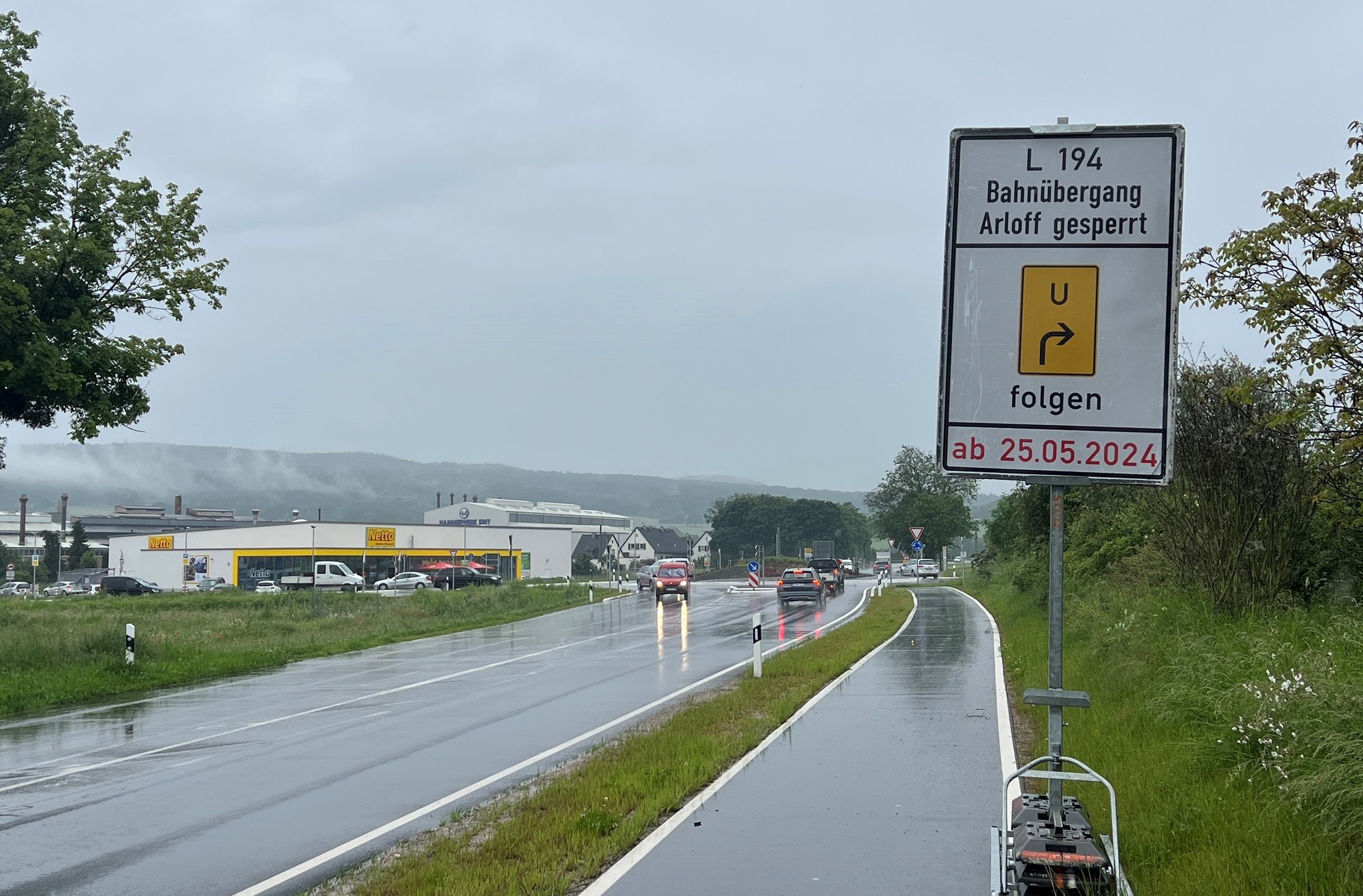 Die Deutsche Bahn wird im Zuge des Wiederaufbaus der Erfttalbahn den Bahnübergang an der L 194 im Bereich von Bad Münstereifel-Arloff (Hammerwerk) sanieren. Für die Gleisarbeiten muss die Landstraße daher von Samstag, 25. Mai, bis einschließlich Mittwoch, 29. Mai, für den Verkehr komplett gesperrt werden. Die Umleitung verläuft ab Iversheim über die K 44 nach Wachendorf, Petrusstraße, sodann für Lastwagen über die L 11 Antweiler – K 24 Kreisverkehr Billig – Verbindung in Richtung Kreuzweingarten/Rheder. Der übrige Verkehr wird ab Petrusstraße auf die L 11 in Richtung Kalkar geleitet und stößt dann auf den Kreisverkehr L 11/L 194 Arloff. Die Umleitung ist ausgeschildert.