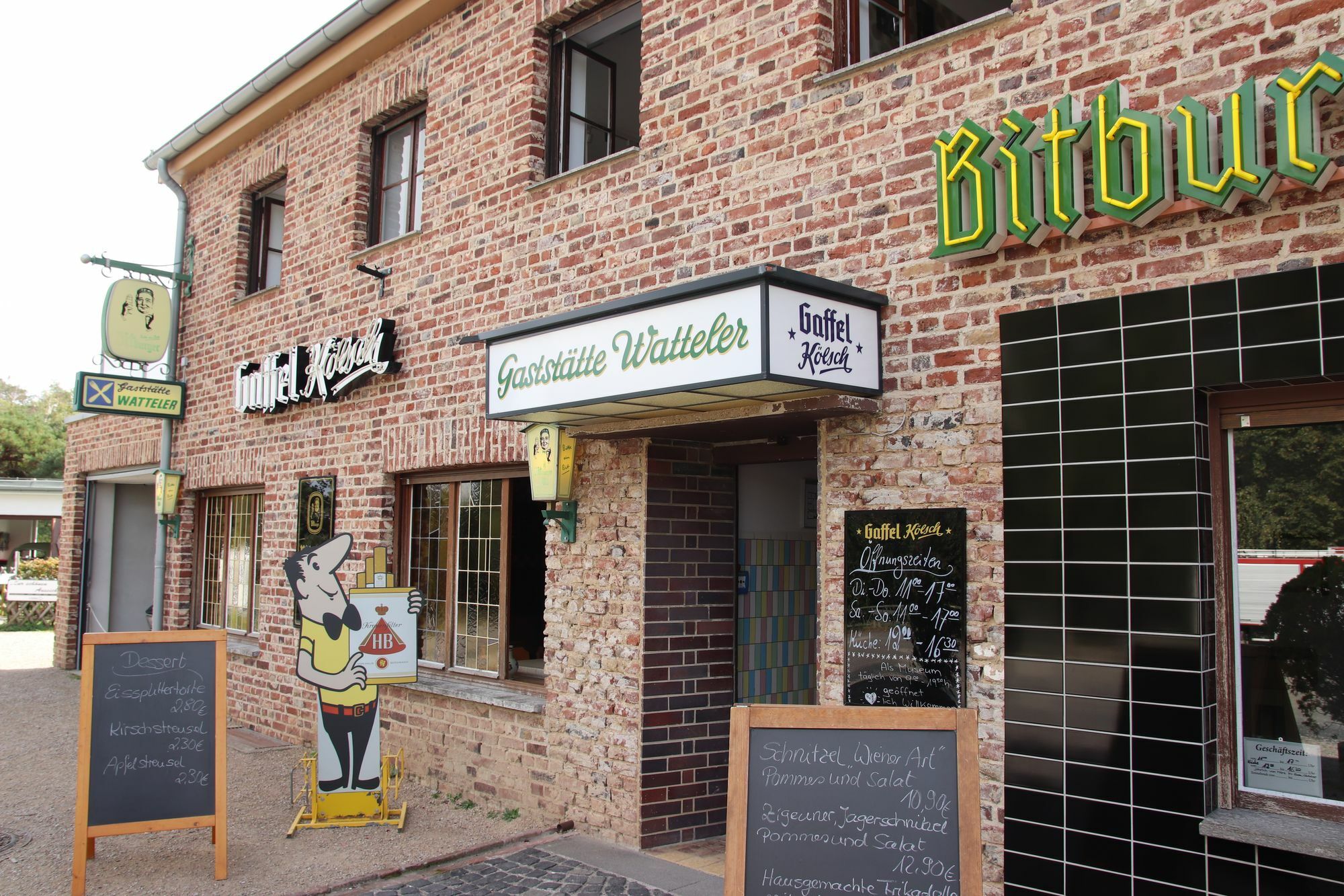 Es sind diese Relikte der jüngeren Vergangenheit, die das LVR-Freilichtmuseum in der Baugruppe „Marktplatz Rheinland“ ausstellt. Sie umfasst Gebäude von der Nachkriegszeit bis zu den Neunziger Jahren. Dabei wird deutlich wie der Krieg das Rheinland verändert hat und wie Altes und Neues nebeneinander existiert. Die ersten Gebäude waren ein Flachdach-Bungalow und die Gaststätte „Watteler“, die nach Kommern transloziert wurde. „Das war unser Gesellenstück“, erzählt der stellvertretende Museumsleiter Dr. Carsten Vorwig. Wurden die Häuser in den alten Baugruppen noch komplett zerlegt und in Kommern wieder aufgebaut, so war das bei der Gaststätte nicht mehr möglich.