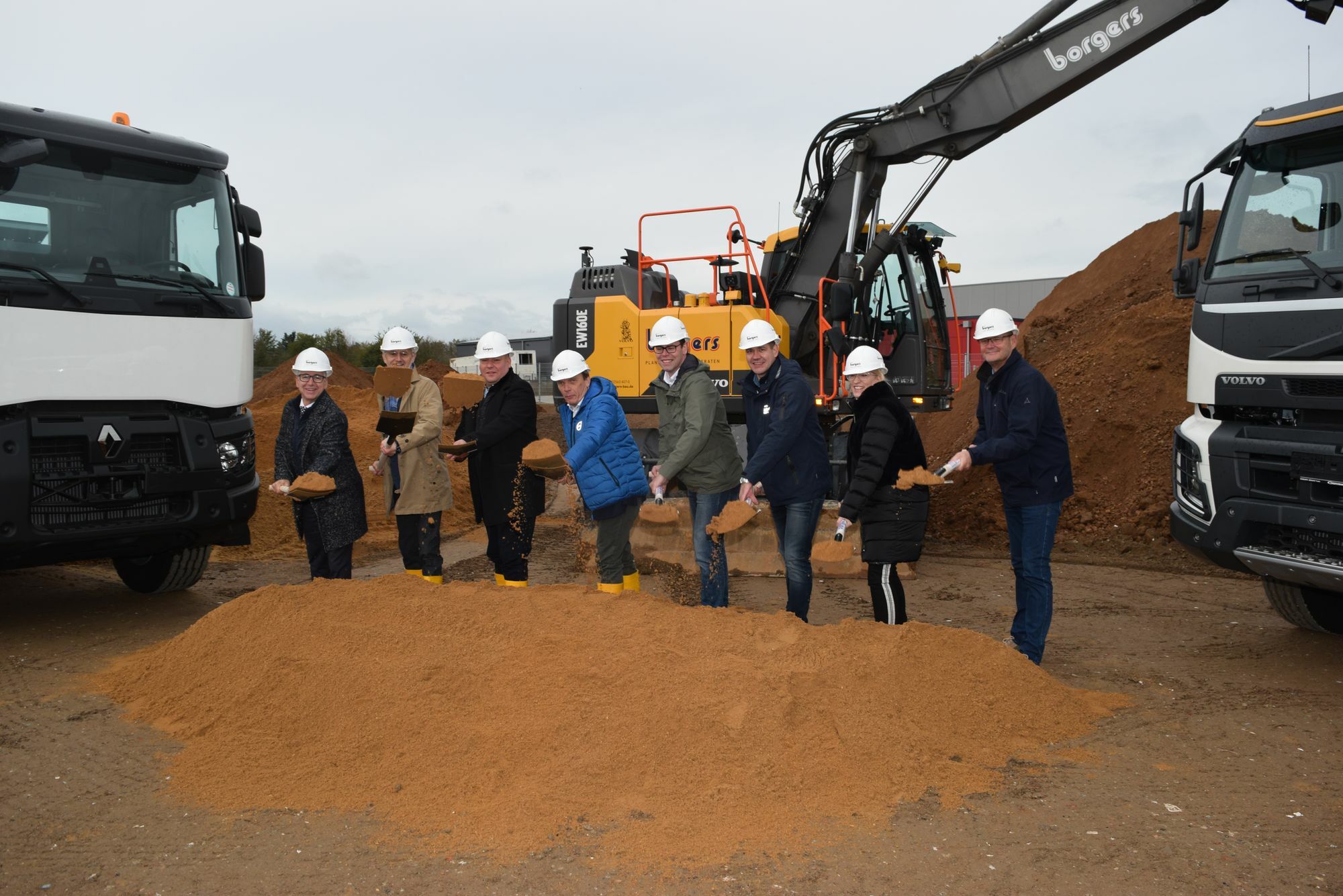 Mit einem symbolischen Spatenstich haben im Industrie- und Gewerbepark am Silberberg (IPAS) die Bauarbeiten für das neue Werkstattgebäude des Volvo- und Renault-Trucks-Betrieb begonnen.