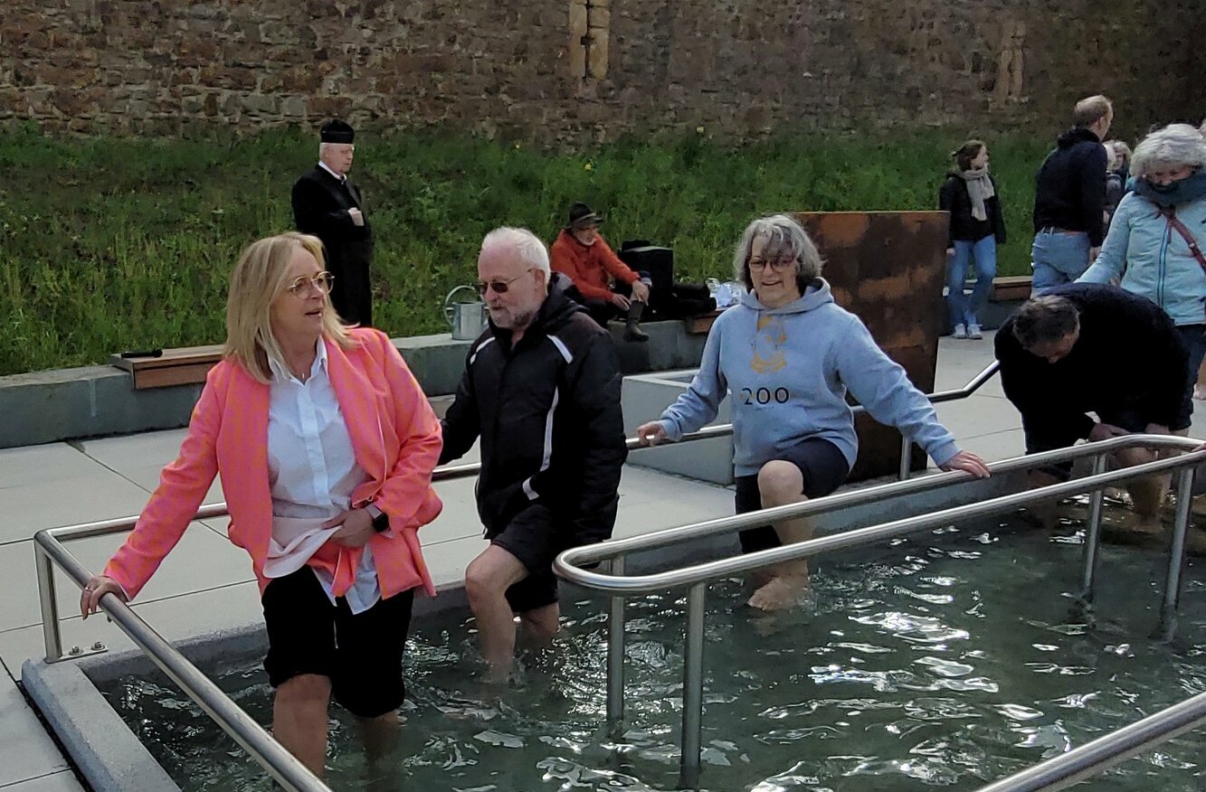 Die Eröffnung der neuen Kneipp-Becken wurde im Rahmen des traditionellen »Anwasserns«, mit dem jährlich die Kneipp-Freiluftsaison eingeläutet wird, feierlich begangen. Der Kneipp-Verein Bad Münstereifel, vertreten durch seinen Vorsitzenden Peter Hanschke und zahlreiche weitere Mitglieder, spielt sowohl beim Kneippen in der Stadt als auch beim »Anwassern« eine zentrale Rolle. Der Verein füllt die von der Stadt zur Verfügung gestellten Angebote mit Leben und bietet einen reichhaltigen Kalender an Kursen, Wanderungen, Radtouren und anderen Veranstaltungen. Bürgermeisterin Sabine Preiser-Marian dankte den aktiven Mitgliedern des Kneipp-Vereins für ihr ehrenamtliches Engagement, das diese Angebote erst möglich macht. Den Gästen gegenüber erläuterte der »echte« Pfarrer Kneipp alias Günter Puhe die Elemente und die Technik des Wassertretens und verpasste Interessierten mit der Gießkanne eine Gesichtsanwendung.
