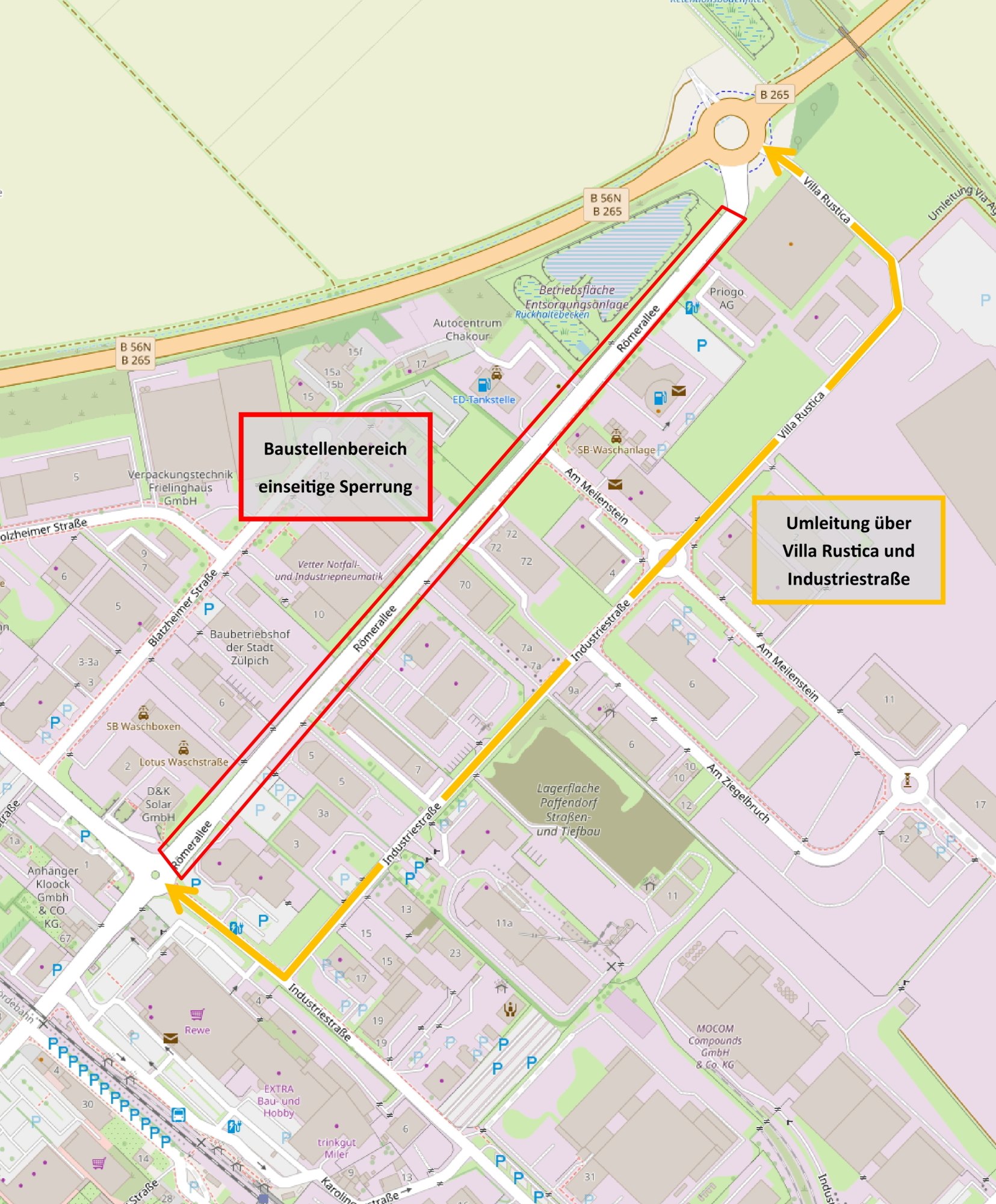 Während der Bauarbeiten wird der Verkehr von der B265 kommend über die Römerallee im Einbahnstraßenprinzip stadteinwärts geführt. Der entgegenkommende, stadtauswärts führende Verkehr wird über die Industriestraße und die Straße Villa Rustica umgeleitet. Die Erreichbarkeit der Grundstücke an der Römerallee soll während der Arbeiten gewährleistet bleiben.