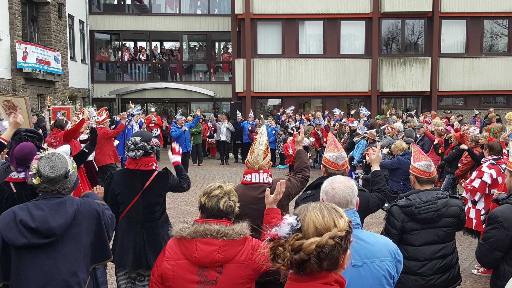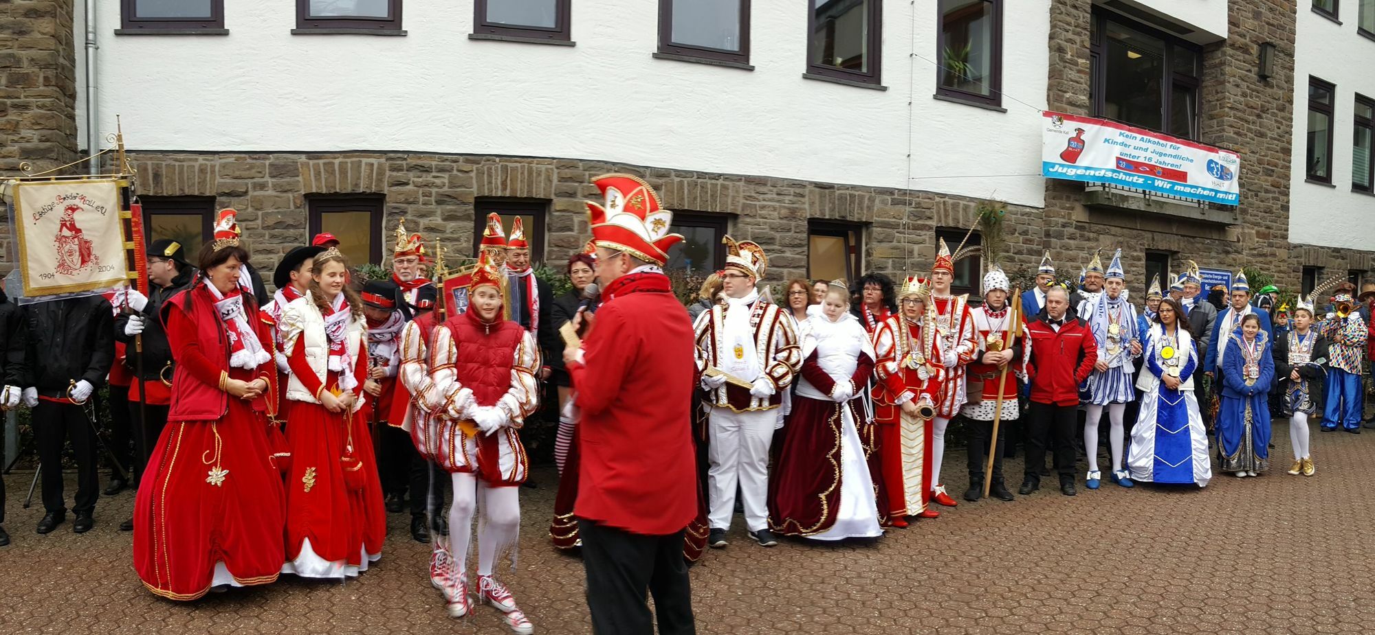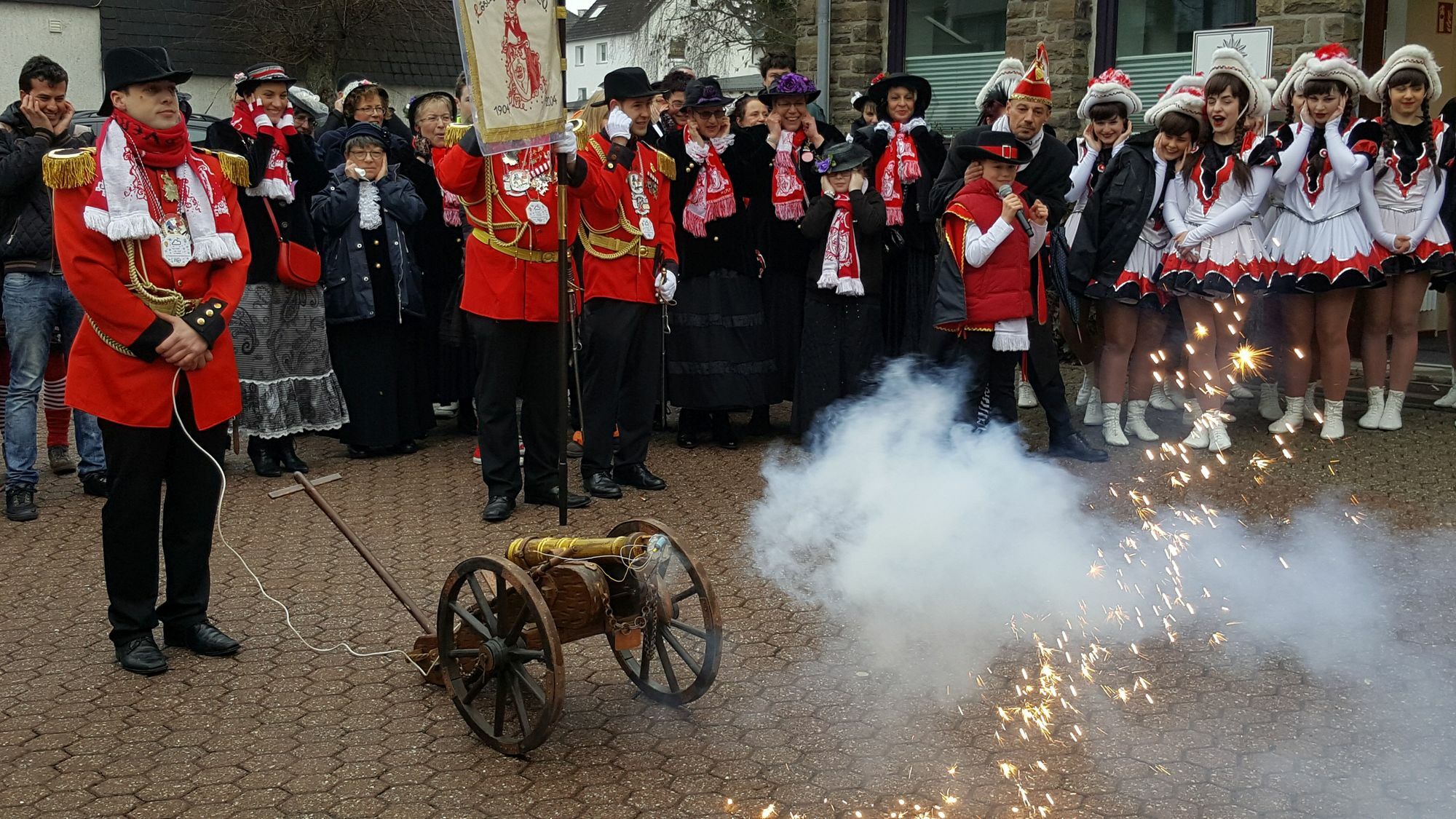 Grund zum Strahlen hatte die närrische Majestät auch reichlich. Denn nicht nur das Kaller Kinderprinzenpaar Leon I. (Blatt) und Lena I. (Ruthenbeck) stand ihr beim Sturm auf das Kaller Rathaus am Weiberdonnerstag tapfer zur Seite. Auch zahlreiche Tollitäten und Abordnungen aus dem gesamten Gemeindegebiet, Rotröcke, viele Möhnen, Tanzgarden, Prinzengarde und nicht zuletzt eine große Schar bunt kostümierter Jecken hatte sich auf dem Vorplatz des Rathauses eingefunden. Und so herrschte trotz bescheidenen Wetters eine wirklich prächtige Stimmung. Zu der trug natürlich auch das Gefecht um das Rathaus bei, in dem die Kanone „Möckeflitsch“ eine gewichtige Rolle spielte. Mit ihr nahmen die Gardisten den Beamtenbunker solange unter Beschuss, bis der stellvertretende Kaller Bürgermeister Uwe Schubinski die weiße Fahne schwenkte und sich in Ketten legen ließ. Nach dem offiziellen Start in den Straßenkarneval folgt dann ab 14 Uhr im Saal Gier eine große Karnevalsparty mit dem Entertainer Julian Heldt.