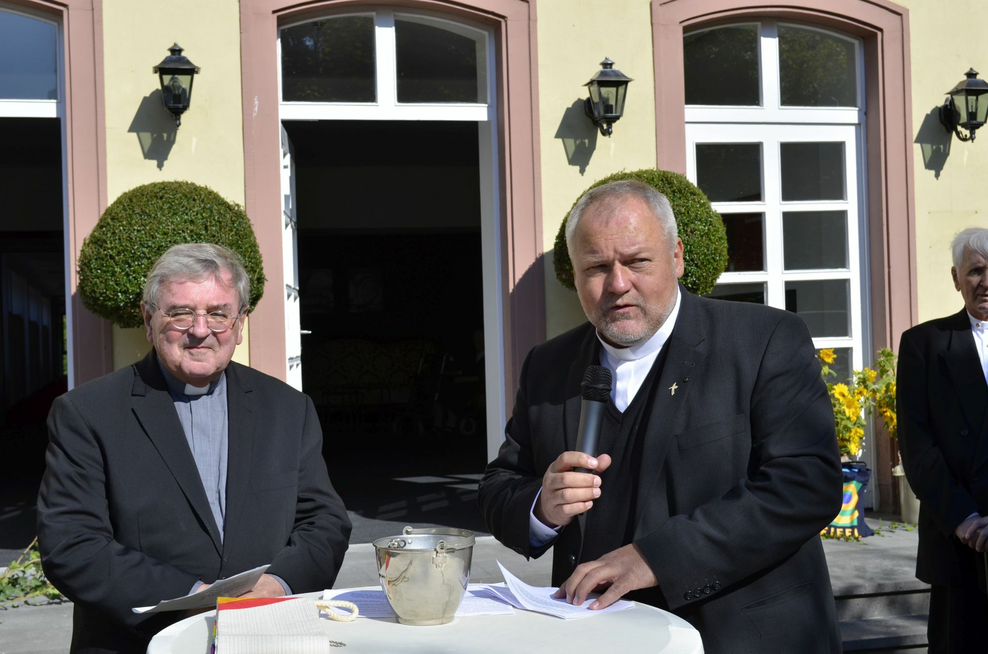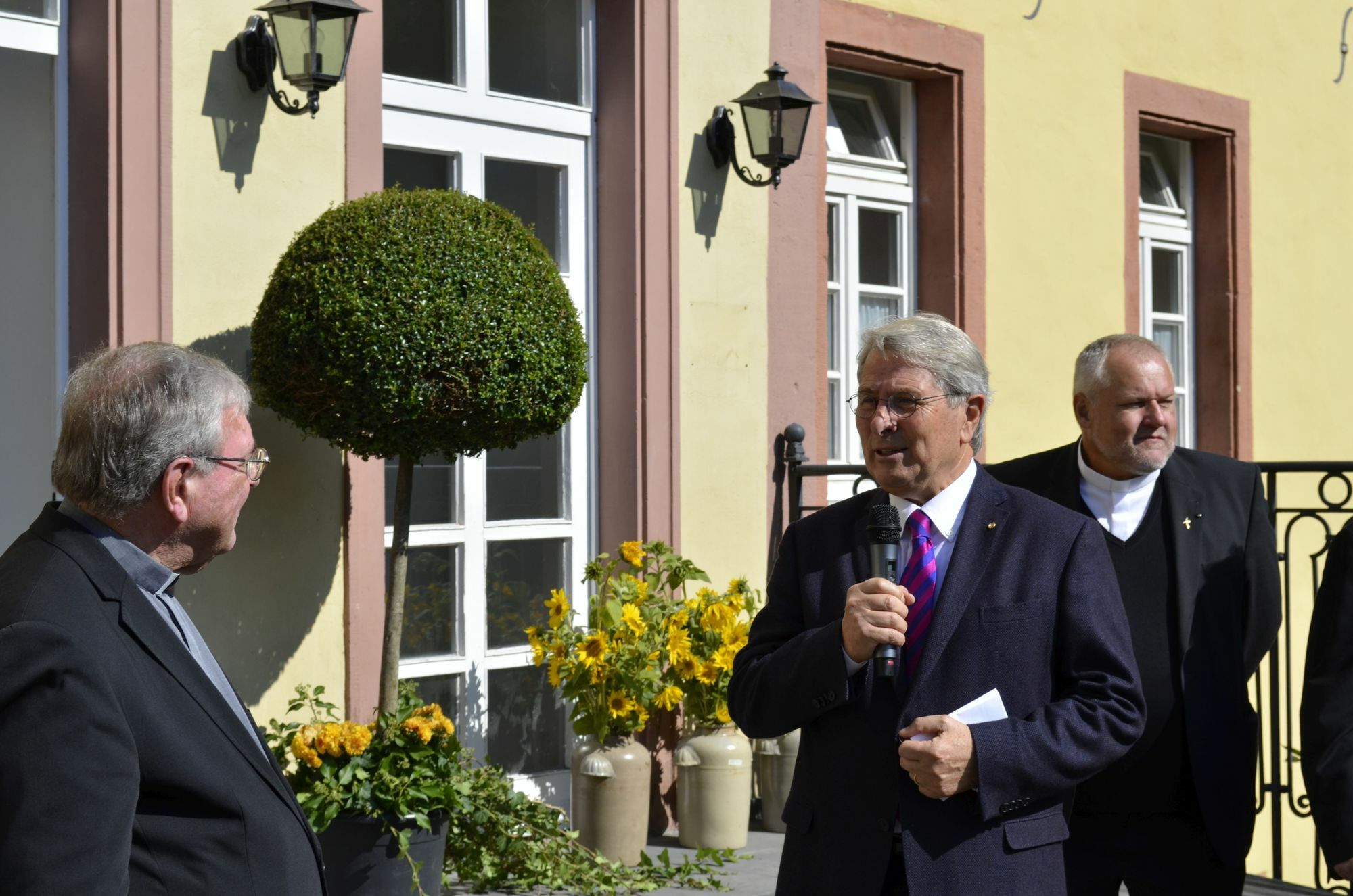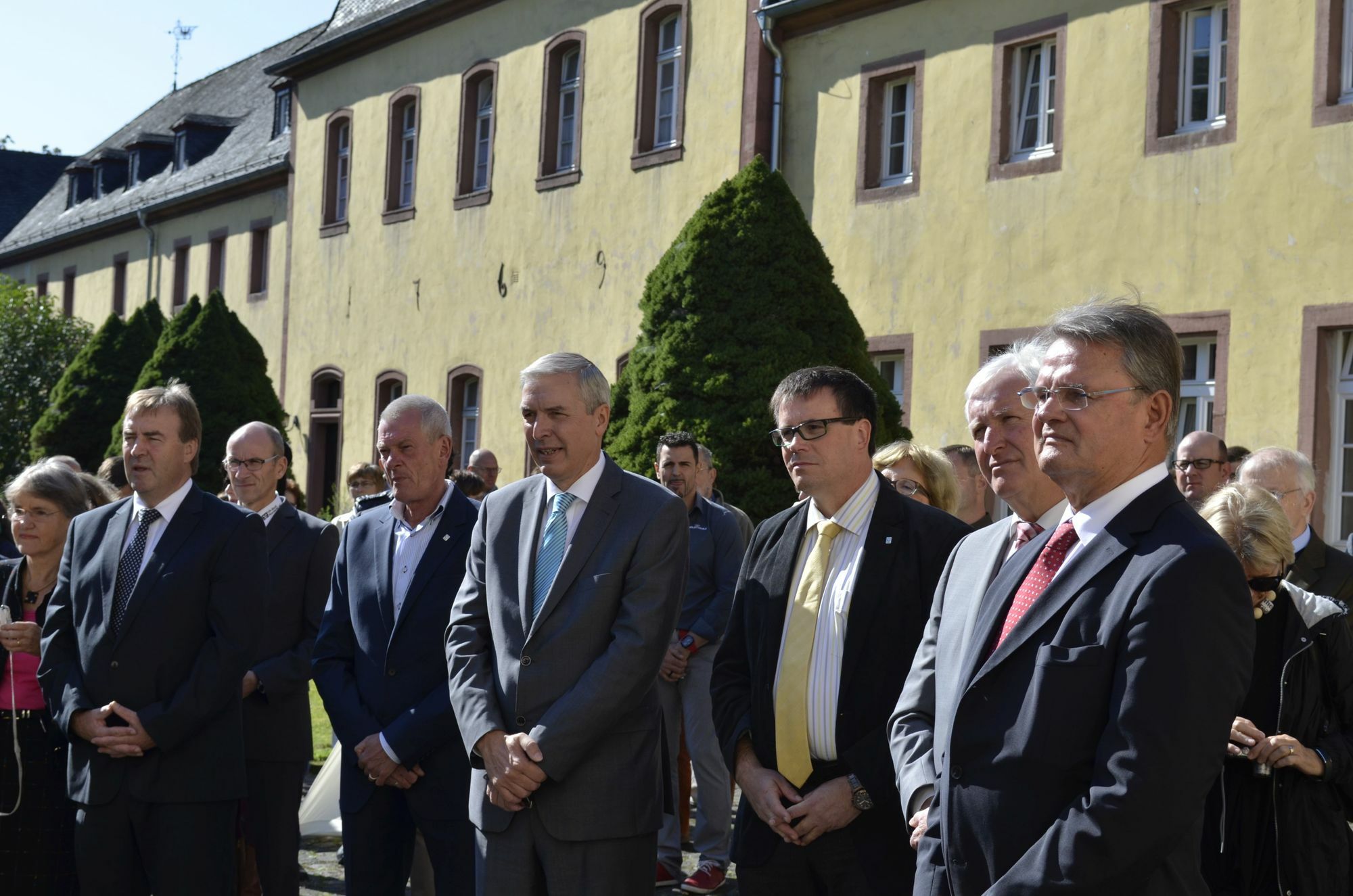 Und noch ein prominenter Zeitgenosse hatte sich unter die Gästeschar gemischt. Der ehemalige Bundesaußenminister und Vizekanzler Klaus Kinkel (FDP) nahm mit seinem Labrador „Jago“ an der Feier teil und hatte sich einen Platz im Schatten gesucht. Pater Hubert Veeser, Provinzial der in Steinfeld ansässigen Salvatorianer, ließ die Zeit Revue passieren, als öffentlich bereits über ein Ende des Klosters Steinfeld diskutiert worden sei. Als „Glücksfall“ bezeichnete er den Umstand, mit Wolfgang Scheidtweiler einen Mann gefunden zu haben, mit dem der Bestand des Klosters letztlich gesichert werden konnte. Scheidtweiler, ein erfolgreicher Unternehmer und Hotelier, stammt selbst aus der Eifel und kennt das Kloster seit Jahren. Zunächst rettete er die Biogasanlage des Klosters vor der Insolvenz und setzte dann den Plan um, im ehemaligen Internat ein Gästehaus mit Zimmern im 4-Sterne-Standard zu etablieren.