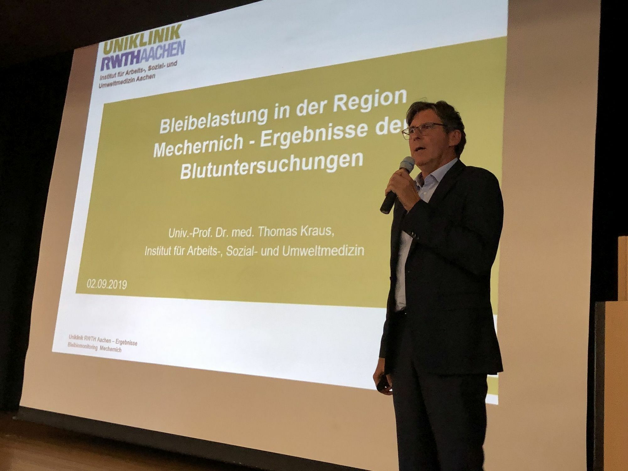 „Es sind keine als gesundheitlich bedenklich anzusehenden Bleikonzentrationen im Blut messbar.“ So heißt es in der Zusammenfassung zu den Blutuntersuchungen im Mechernicher Stadtgebiet, deren Ergebnisse eben von Prof. Dr. med. Thomas Kraus, Leiter des Institutes für Arbeits-, Sozial- und Umweltmedizin der RWTH Aachen, in der gut besetzten Aula des Turmhofgymnasiums vorgestellt wurden. Besonders erfreut zeigte sich nicht nur Prof. Dr. Thomas Kraus über die Tatsache, dass es derzeit keinen Hinweis auf eine erhöhte Belastung bei den untersuchten 33 Kindern im Alter zwischen 2 und 14 Jahren gibt.
