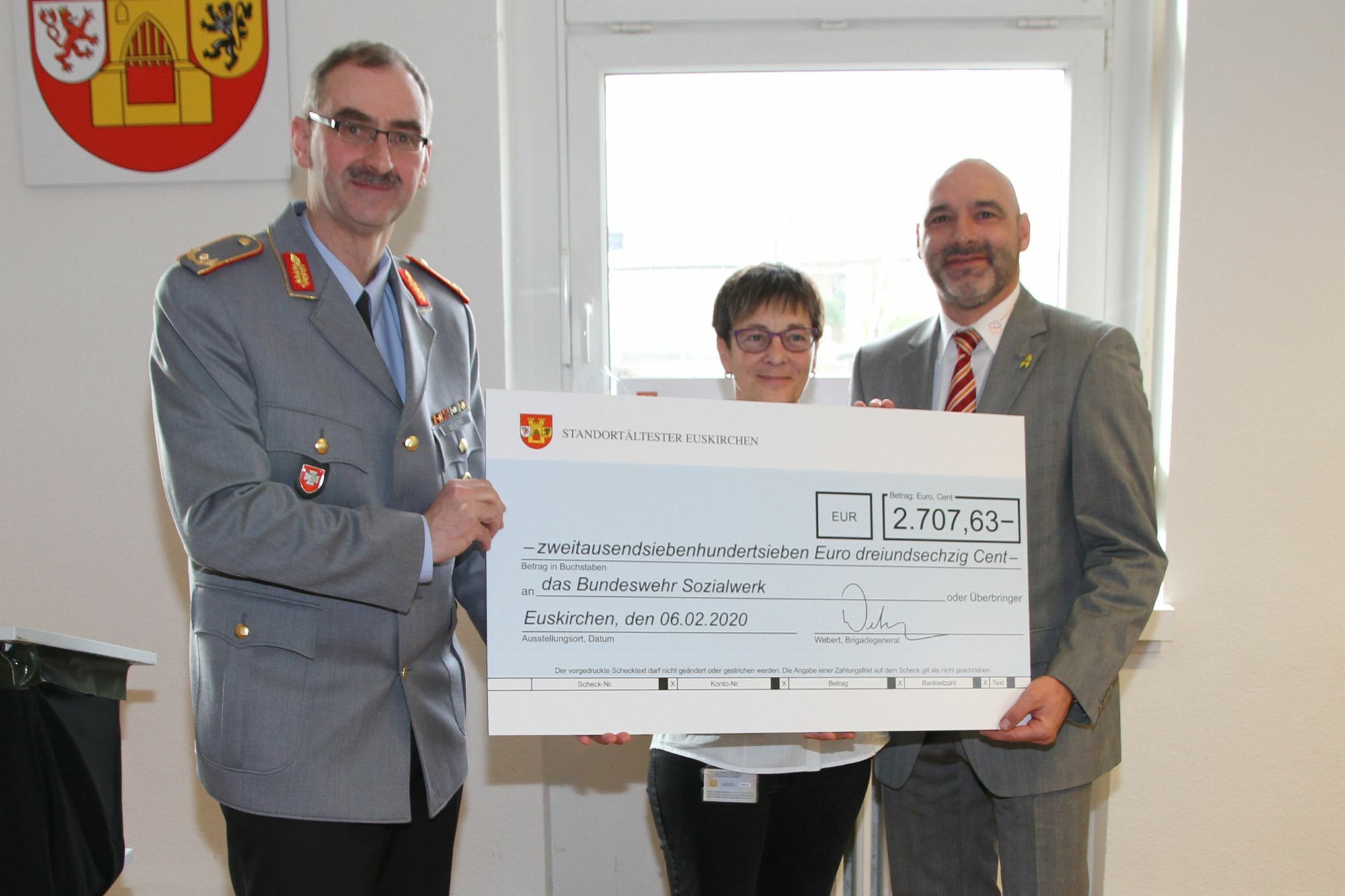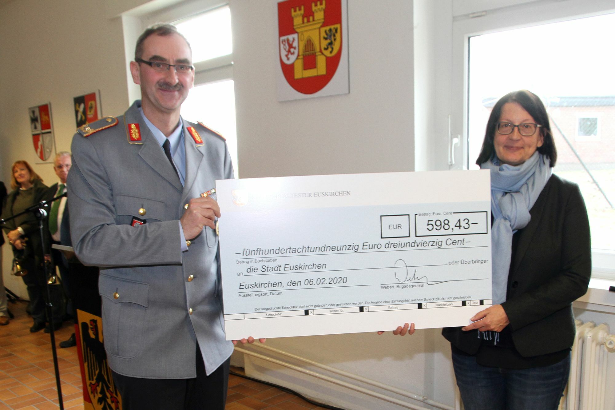 Anschließend überreichte Brigadegeneral Webert Schecks, sowohl an die Stadt Euskirchen, vertreten durch die erste stellvertretende Bürgermeisterin Christiane Loeb, als auch an das Bundeswehr-Sozialwerk, repräsentiert vom Geschäftsführer Bereich West, Regierungsamtsrat Ralf Miltenberger. Das Geld stammt aus den Erlösen des traditionellen Adventsbasars.