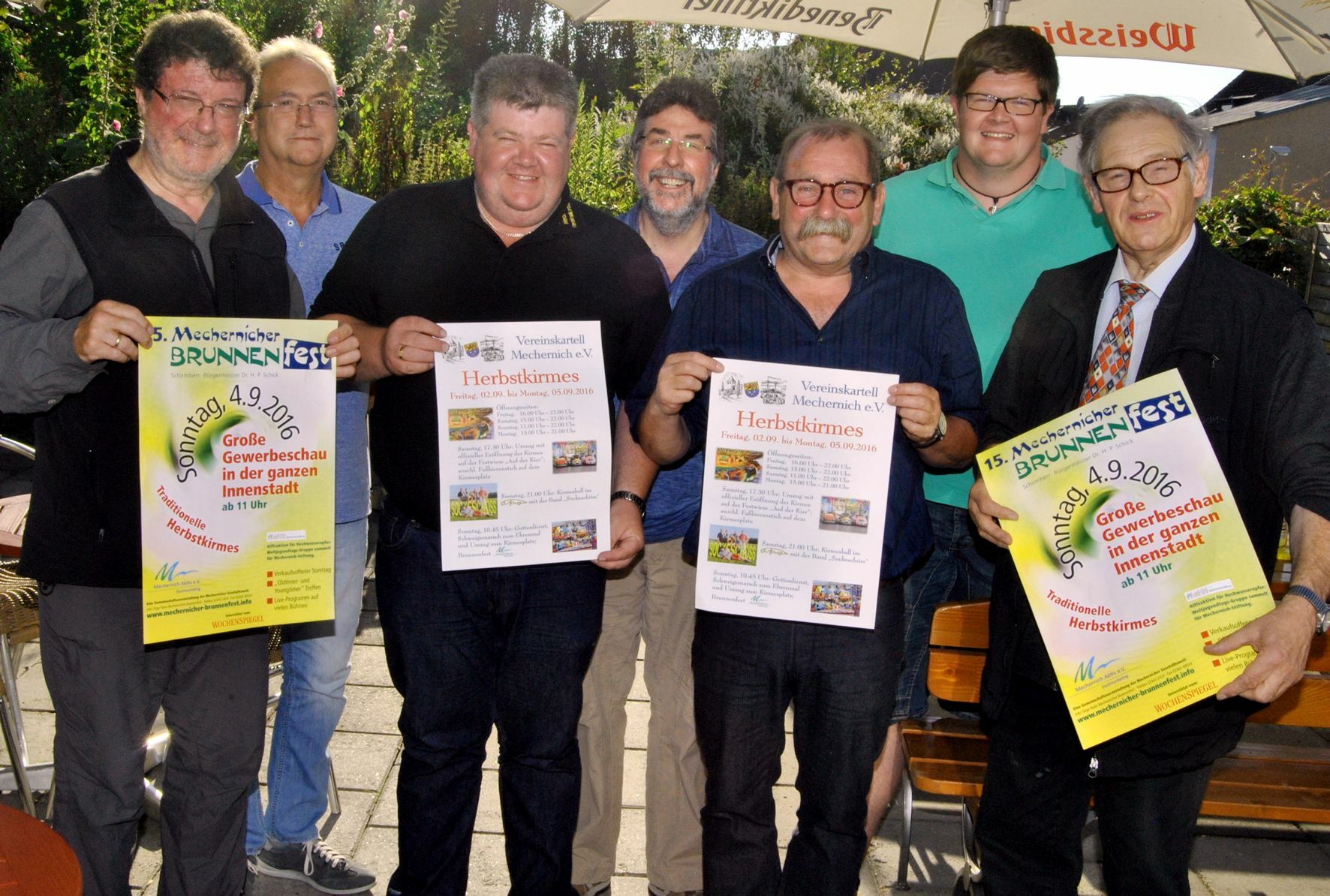 „Damit erhoffen wir uns eine Belebung der Kirmes“, erklären Brunnenfest-Organisator Heinrich Schmitz und Marcel Hembach vom Vereinskartell Mechernich. Denn nicht anders als in vielen vergleichbaren Städten hat auch das Mechernicher Kirmestreiben seit Jahren mit einer gewissen Talfahrt zu kämpfen. Die Aussicht auf viele Besucher macht den Ausstellern die Entscheidung in diesem Jahr leicht, ihre Karussells, Spiel- und Imbissbuden nach Mechernich zu schicken. Anders als im Vorjahr, als alle Bemühungen, große Fahrgeschäfte zu verpflichten, fehlschlugen, wird es diesmal auf jeden Fall einen Autoscooter und auch ein weiteres großes Fahrgeschäfte geben. Auch für das Brunnenfest selbst liegen bereits zahlreiche Anmeldungen vor. „Es wird keine kahle Stellen in der Stadt geben“, freut sich der Cheforganisator, bei dem alle Fäden zusammenlaufen, auf ein großes, buntes Bild. „Von der Zusammenlegung profitieren beide Veranstaltungen“, so Schmitz weiter. Während der Rewe-Parkplatz und der Brunnenplatz im Zeichen der Kirmes stehen werden, ist die große Showbühne diesmal vor dem Rathaus das Zentrum des Brunnenfestes.