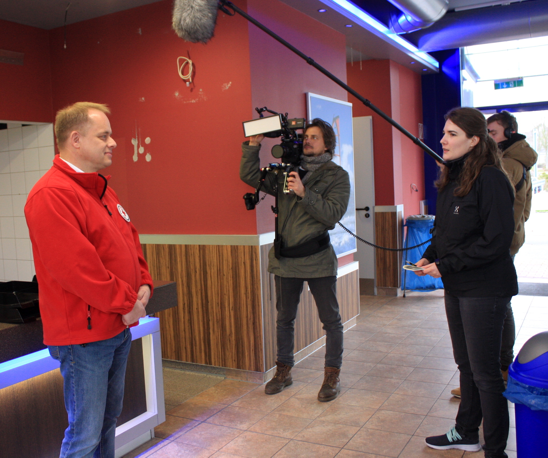 Die Idee einer annähernd kontaktlosen Probenentnahme an einem Drive-In-Schalter, an dem es jetzt „Fast-Testing“ anstatt Fastfood gibt, ist außergewöhnlich. Während die letzten Vorbereitungen für die Betriebsaufnahme getroffen wurden, war ein Kamerateam der Dokumentations- und Reportagesendung „ZDFzoom“ zu Gast, die gerade einen Beitrag zum Thema Katastrophenschutz drehen (Ausstrahlungstermin: Mittwoch, 1. April, 22.45 Uhr, ZDF).