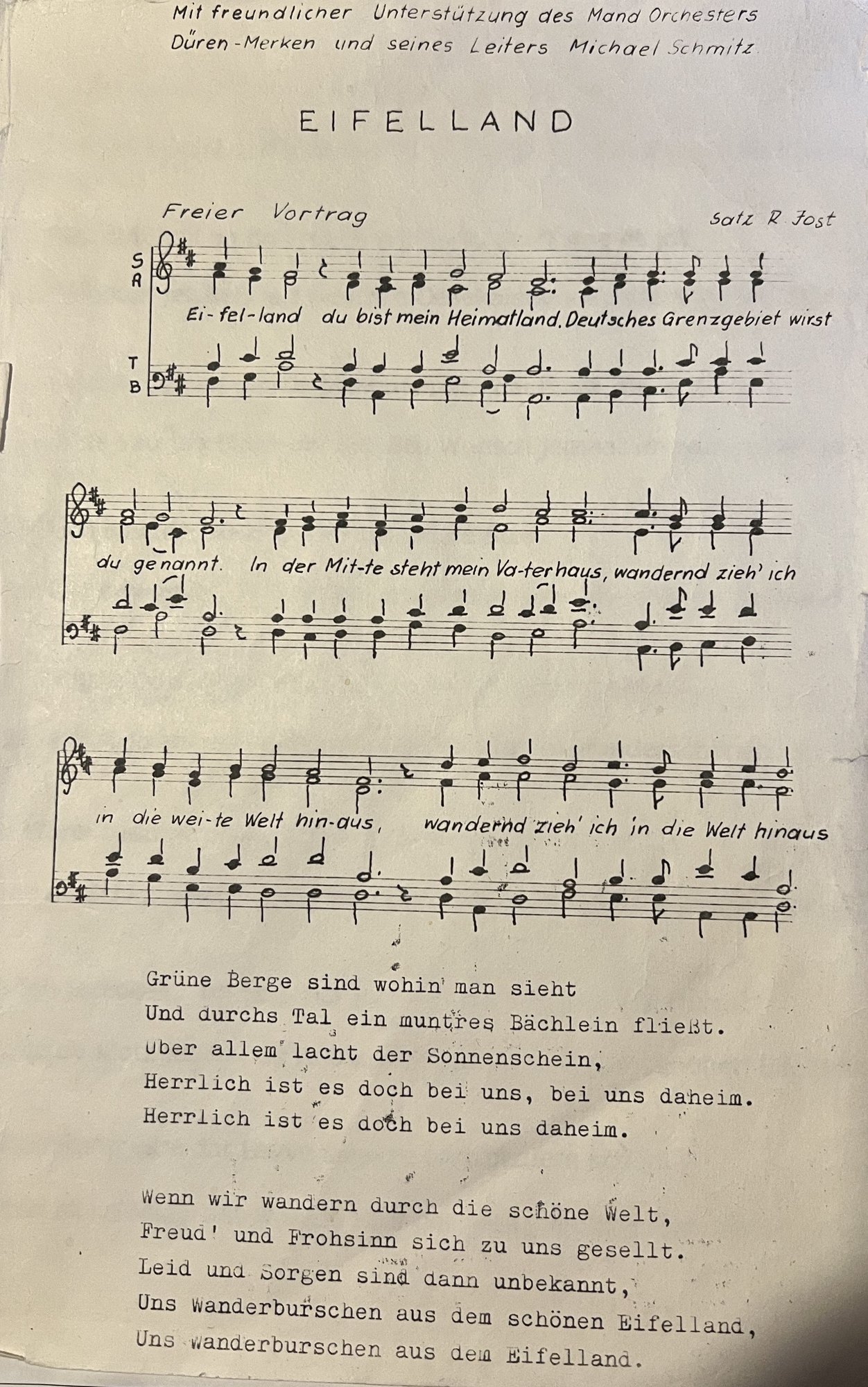 »Wir haben überall gesungen«, erzählt sie über die Auftritte des Chores, der um die 30 Sängerinnen und Sänger zählte. Noch heute besitzt Irmgard Umnik das Originalnotenblatt. Darauf vermerkt: Rolf Jost, der Dirigent des MGV, arrangierte den mehrstimmigen Chorsatz. Wer Text und Melodie ursprünglich verfasste, weiß Irmgard Umnik auch nicht. Wahrscheinlich handelt es sich um ein regionales Volkslied, dessen Herkunft im Dunkeln liegt. Sie wurde im September 1999 vom Kreissängerbund Euskirchen für 25 Jahre aktives Singen geehrt. »Ich habe noch mindestens zehn Jahre länger gesungen«, schmunzelt sie.
