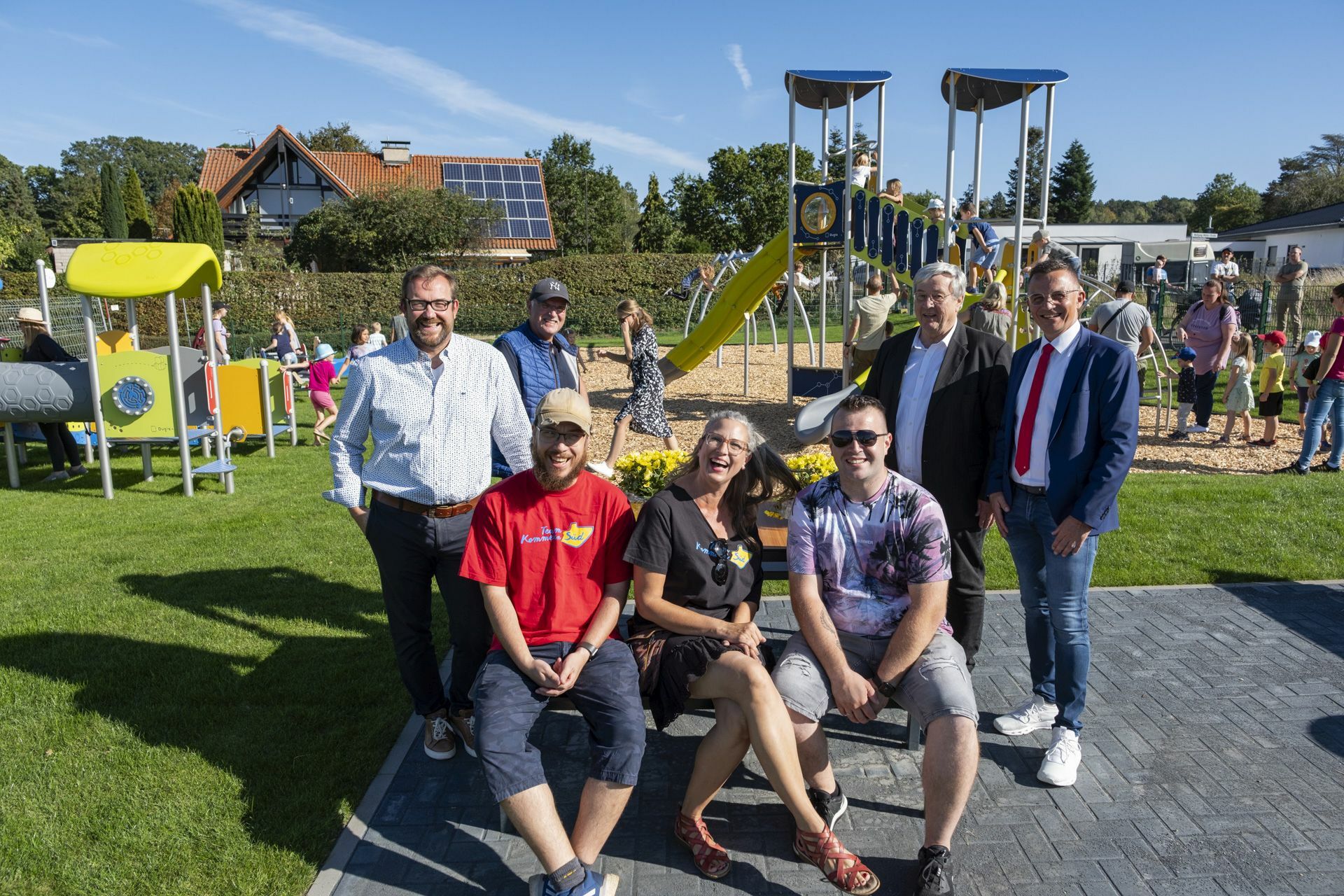 Dem vorausgegangen war eine Beteiligung des Dorfes. »In zwei Arbeitsgruppen wurden Wunschzettel für die Spielgeräte entworfen«, sagt Nathalie Konias, die zur Eröffnung auch den Mechernicher Beigeordneten Thomas Hambach in Kommern-Süd begrüßen konnte. In den vergangenen zwei Monaten wurden sodann zwei große Geräte mit Rutschen realisiert – das eine für die etwas kleineren, das andere für die etwas größeren Kinder. Zudem gibt es eine Wippe, einen Sandkasten zwei Schaukeln, eine Nestschaukel und ein Balancierpfad. Was jetzt noch fehlt, sind ein paar Bäume als Schattenspender. Dafür werden nochmal Spenden nötig. »Außerdem werden wir noch eine Buchenhecke als Begrenzung bepflanzen, da, wo jetzt noch die Bauzäune stehen«, erläutert der städtische Grünflächeningenieur Christoph Marx, der das Projekt von Seiten der Stadt betreute.