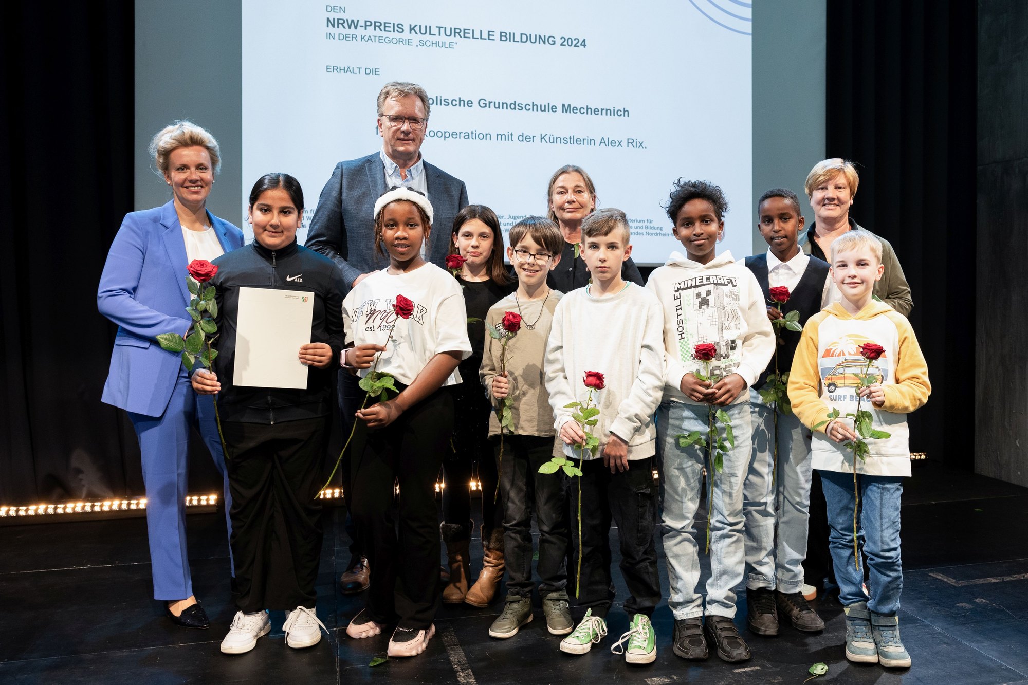 »Als ich im März die Mail von der Landesregierung bekommen habe, musste ich erst nochmal drei Mal drüber lesen und recherchieren«, erzählte Ulli Lindner-Moog, Rektor der Katholischen Grundschule Mechernich (KGS). In Kooperation mit der bildenden Künstlerin Alex Rix hatte man sich Anfang Februar mit den geschaffenen kulturellen Projekten beim Ministerium für Kultur und Wissenschaft des Landes NRW für den Preis beworben – und den »NRW-Preis für Kulturelle Bildung 2025« abgeräumt.