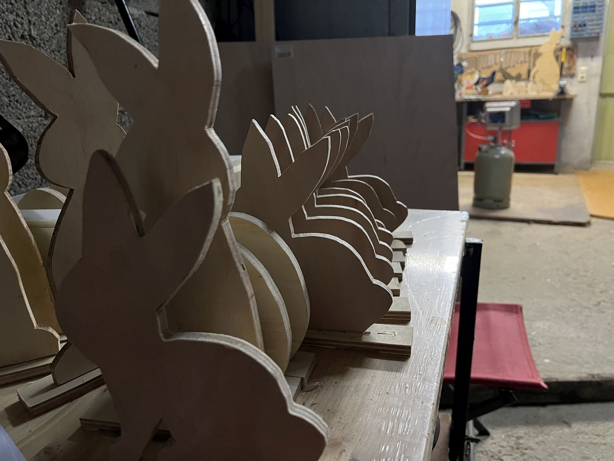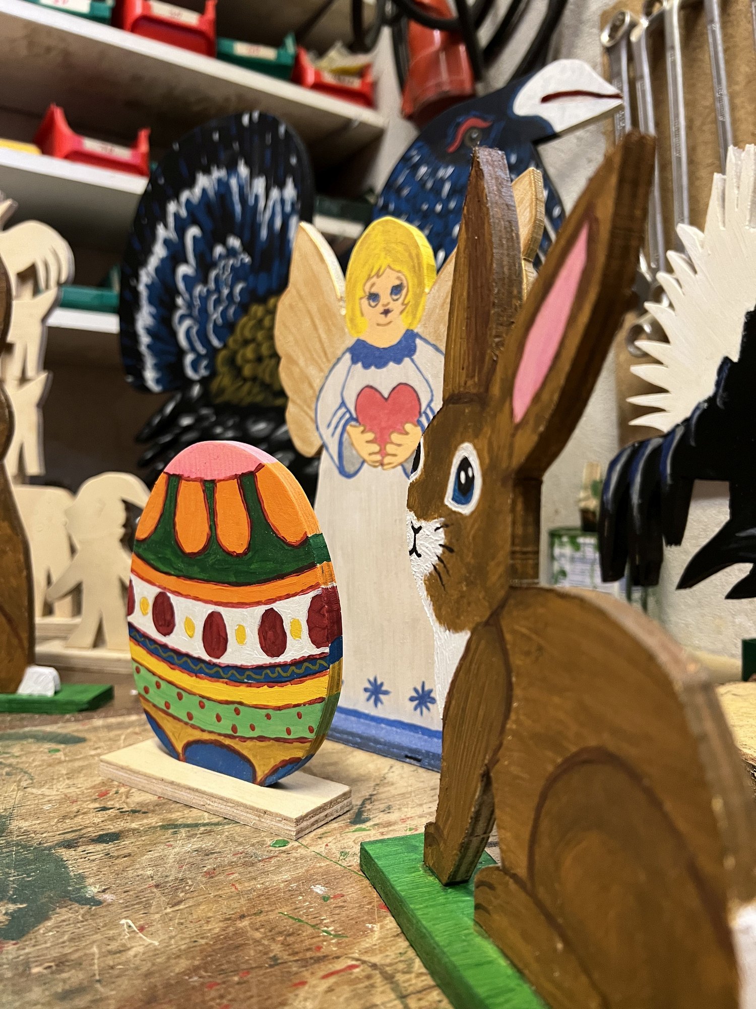 Tatsächlich ist die Nachfrage groß. Rund 15 Kindergärten beliefert Lothar Schuster mit seinen handgefertigten Erzeugnissen, die er an seiner Bandsäge herstellt. »Ich verteile meine Sachen an Kindergärten, von Höfen bis hinunter nach Scheven«, schmunzelt der Mann, der ursprünglich Dachdecker gelernt hat. Heute fertigt er aus Holzplatten Engel, Wölfe, Hasen, Ostereier, Auerhähne, Rehe, Hühner, Gänse, die Bremer Stadtmusikanten, Schneewittchen und die sieben Zwerge sowie viele andere Motive.