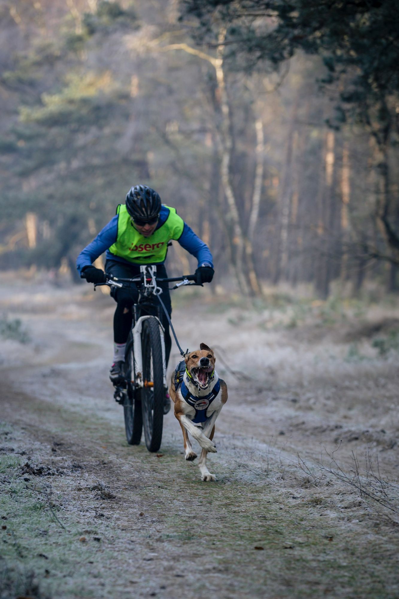 »Wenn er das nicht macht, liegt man schnell auf der Nase«, ergänzt Jule Prins. Während ihr Ehemann Marc hinter dem Hund her sprintet und dabei »ständig schneller laufen muss, als ich eigentlich kann«, sitzt Jule Prins auf einem Mountainbike. »Bikejöring« nennt sich diese Spielart, die vom Fahrer viel technisches Können auf dem Rad verlangt. Ein Können, dass im Prinzip beide Dahlemer Sportler haben, denn sie kommen aus dem Mountainbike-Sport, in dem sie professionell unterwegs waren. Ein schwerer Sturz von Jule Prins beendete diese Karriere und eigentlich wollte sie sich auch nie mehr auf ein Mountainbike setzen. »Die Fasizination, mit dem Hund als Team zu arbeiten, die Power, die Geschwindigkeit und das Vertrauen haben mich den Vorsatz schnell vergessen lassen«, schmunzelt Jule Prins.