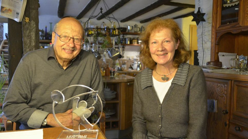 Eberhadt Stelzmann und Karin Didié-Stelzmann präsentieren in ihrem schmucken Haus in Hollerath ihre Auszeichnung, den »LEOPOLD«. Foto: Michael Nielen