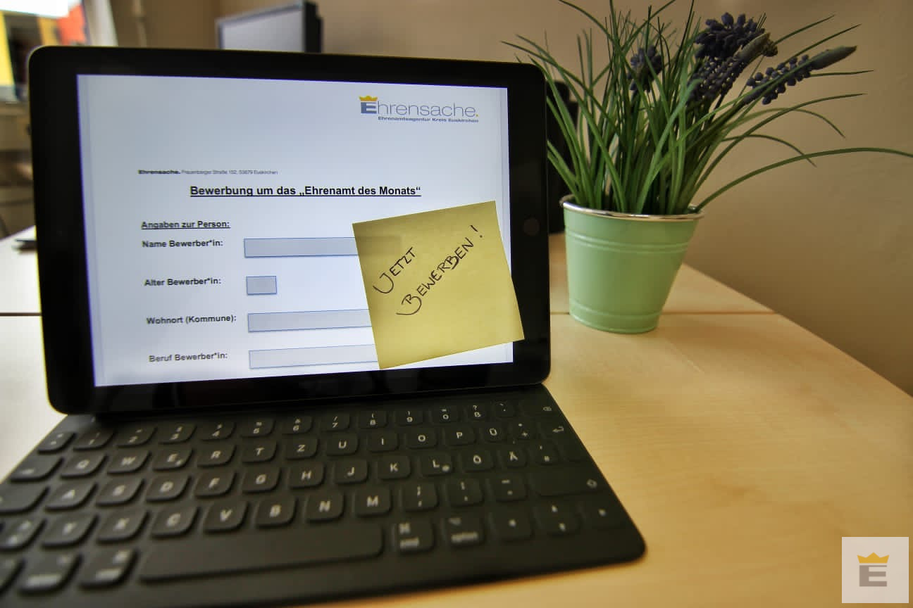 Ob Nachbar, oder jemand im Ort, der es verdient hat als »Ehrenamt des Monats« ausgezeichnet zu werden oder vielleicht auch man selbst? Bewerben kann sich jeder, der sich ehrenamtlich engagiert. Dabei nimmt die »Ehrensache.« sowohl Eigen- als auch Fremdbewerbungen an. Zum Einreichen einer Bewerbung oder für weitere Informationen zu dieser Rubrik, wenden Sie sich bitte an das Team der »Ehrensache.« unter ehrenamt@kreis-euskirchen.de oder unter 02251/15-1361.