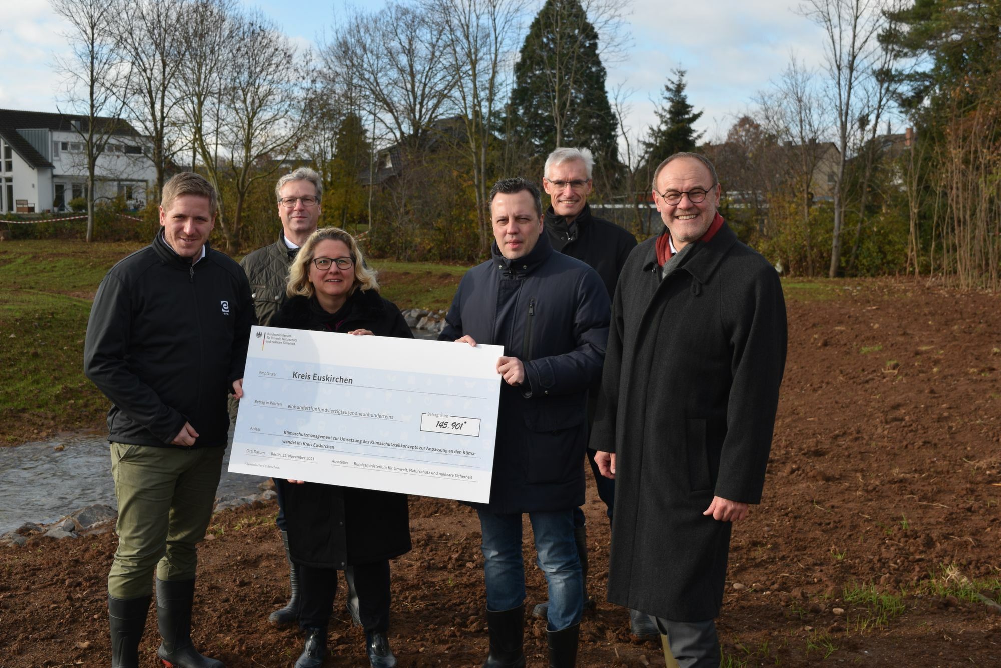 Gemeinsam mit Vertretern des Kreises, der Stadt Euskirchen, und des Erftverbands besuchte Svenja Schulz Euenheim. Dort wurde der Bachlauf des Veybachs renaturiert. Seit einigen Wochen fließt der Bach dort durch ein neues Bett (wir berichteten). Neben ökologischen Aspekten dient diese Maßnahme auch dem Hochwasserschutz. »Wir haben hier ein tolles Beispiel, wie man auch einer Renaturierung mehr Hochwasserschutz schaffen kann, weil hier der Veybach aus den Ortschaften herausgelagert worden ist«, betonte Landrat Markus Ramers. Allerdings habe die Umsetzung der Maßnahme von den ersten Überlegungen an 29 Jahre gebraucht, wie Erftverband Vorstand Dr. Bernd Bucher vorab erklärt hatte. »Das zeigt wie lange solche Genehmigungsverfahren dauern, das zeigt aber auch, 131 Tage nach der Flutkatastrophe, dass wir jetzt nicht wieder 29 Jahre warten dürfen, bis hier oder an anderen Stellen weitere Schutzmaßnahmen getroffen werden können«, sagte Ramers. Der Kreis sei darauf angewiesen, dass bei Bund und Land dafür gesorgt werde, dass solche Verfahren einfach kürzer und schneller umgesetzt würden, so der Landrat. Umso erfreuter zeigte sich der Landrat dass die Ministerin einen Zuwendungsbescheid über 146.000 Euro im Gepäck hatte, obwohl der Kreistag erst im Sommer entsprechenden Förderantrag gestellt hatte. Mit den Mitteln will der Kreis die Stelle für einen Klimawandel-Anpassungsmanager schaffen, der entsprechende Projekte umsetzt.