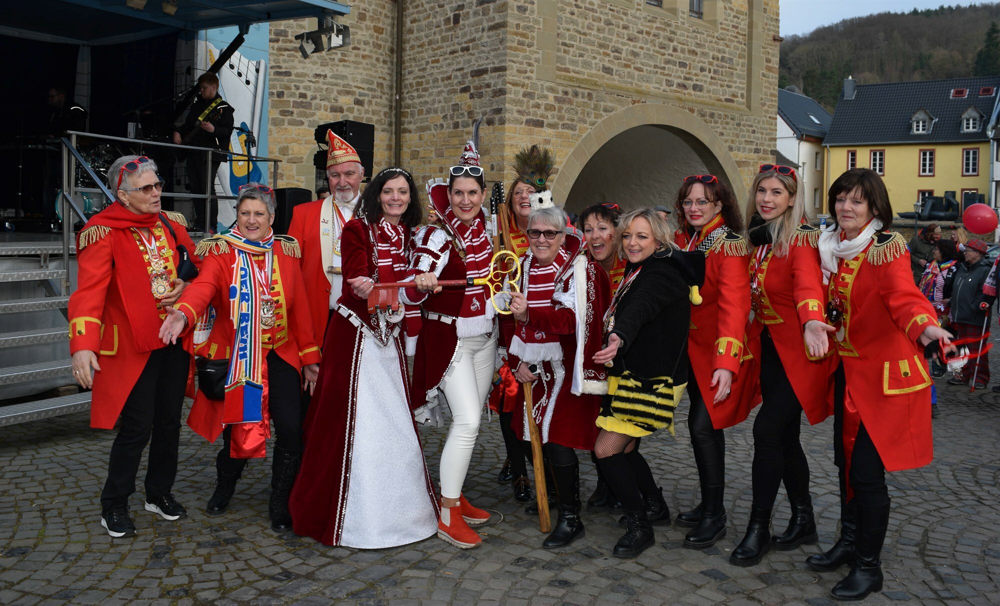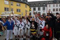 Seit dem heutigen Morgen feierten in Bad Münstereifel die Jecken auf dem Platz vor dem Rathaus. Auf der Bühne wurde ein abwechslungsreiches, närrisches Programm geboten. Neben Tanz- und Musikeinlagen zahlreicher heimischer Gruppen, zeigten auch die "Morris Men" aus der Partnerstadt Ashford ihr tänzerisches Können. Erst am Nachmittag schaffte es dann das Dreigestirn der KG Mutscheid, Prinz Anja I, Jungfrau Nicole und Bauer Claudia, der Bürgermeisterin den Schlüssel für das Rathaus abzunehmen.