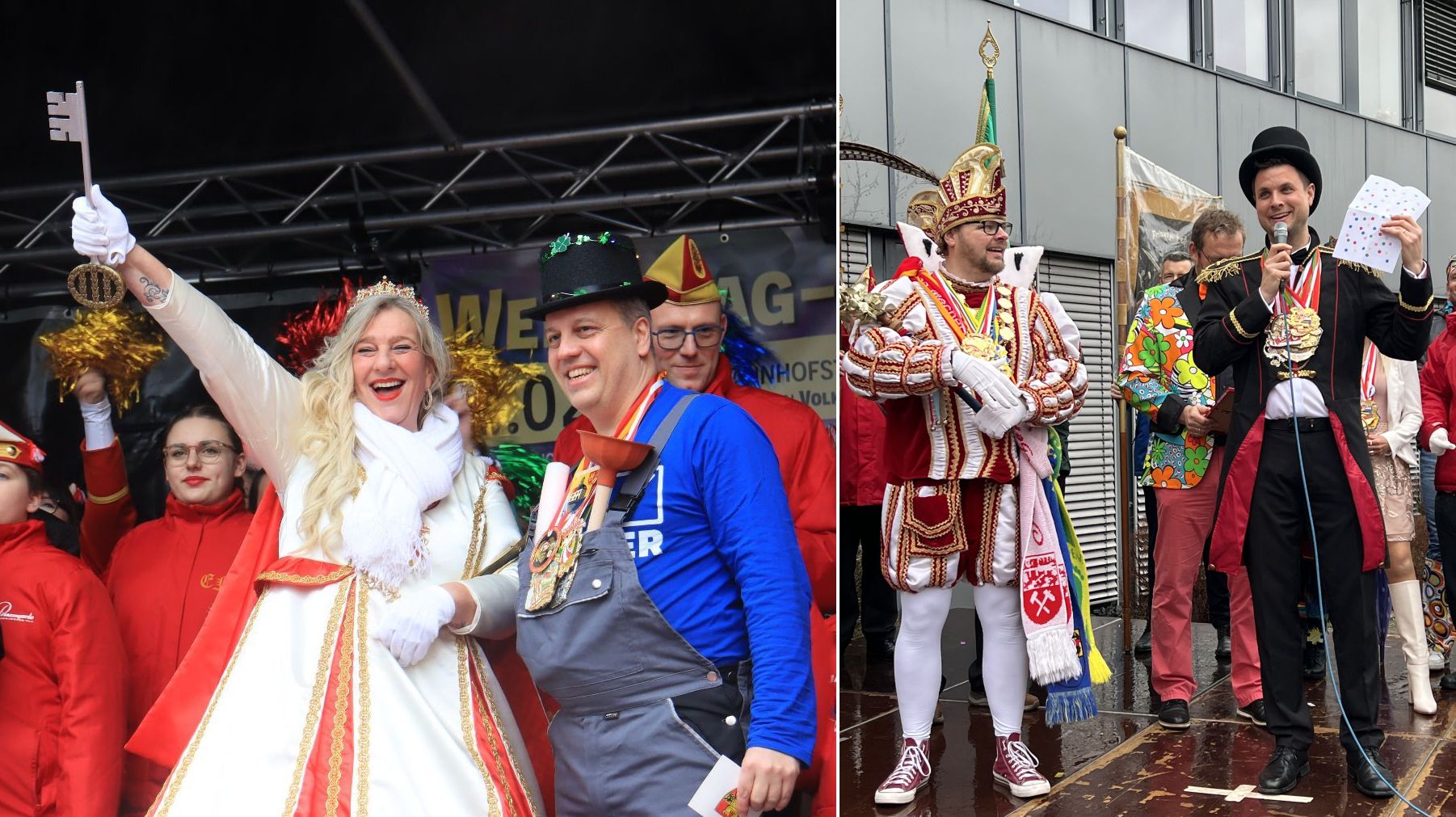 In Euskirchen trotzten viele Jecken dem Regen und versammelten sich vor dem Veybach-Center zur Eröffnung des Straßenkarnevals. Prinzessin Colette I. (Leber) und Küfer Rodney (Smith) übernahmen das Kommando über die Euskirchener Narren.