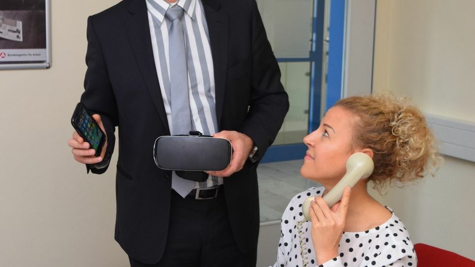 So sieht die Arbeitswelt 4.0 aus: Johannes Klapper mit Smartphone und Virtual-Reality-Brille statt Telefon und Schreibmaschine.