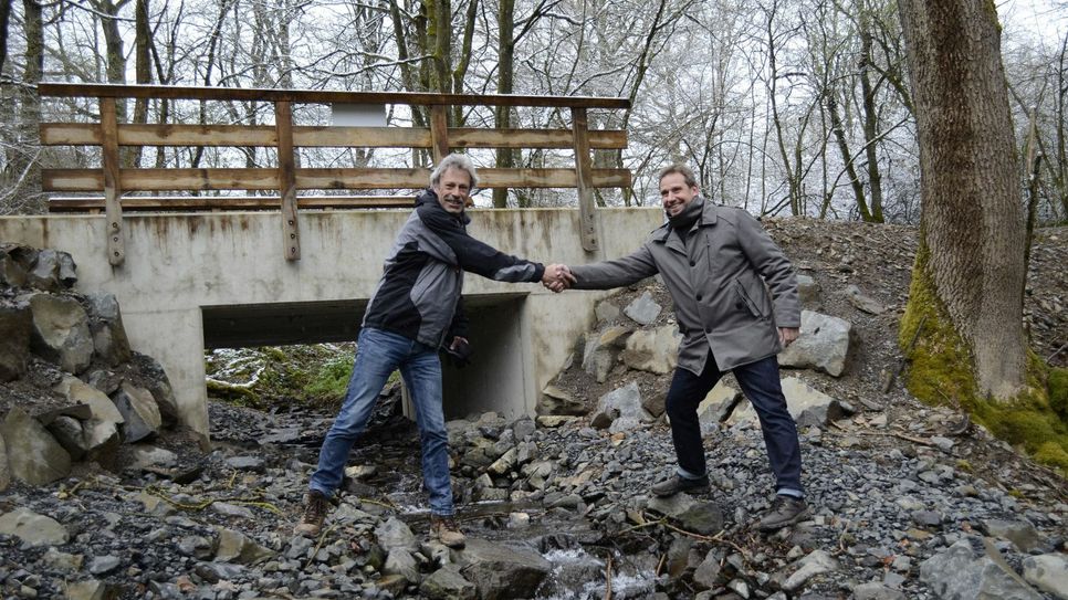 Andreas Glodowski: »Im Rahmen der Realisierung des Bürgerwindparks Schleiden wurden für den Eingriff in die Natur Ersatzgelder festgesetzt. In Absprache mit der Unteren Landschaftsbehörde des Kreises Euskirchen konnte ein Teil dieses Geldes zweckgebunden für die Renaturierungsmaßnahme eingesetzt werden.« Zur Maßnahme selbst: Der Scheckenbach mit seinem Seitental Berescheider Bach wird von mehreren Wald- und Wirtschaftswegen gequert. Dort wurden die Bäche durch Verrohrungen geführt, welche für viele wandernden Arten ein unüberwindbares Hindernis darstellten. Zur Herstellung der ökologischen Durchgängigkeit und dem Anschluss an das Talsystem des Schafbachs wurden diese Verrohrungen entfernt und durch geeignete Durchlässe ersetzt. Dazu wurde einmal eine Wellblechkonstruktion sowie in anderen Fällen Betonbrücken im Haubenprofil angebracht. Wichtig bei diesen Maßnahmen: Das Bachbett wurde mit Basalt-Steinen naturnah ausgestaltet und fügt sich nun nicht nur sehr schön ins Landschaftsbild ein, sondern ist zudem ökologisch sinn- und wertvoll. An allen fünf Bauwerken, die neu hergerichtet wurden, sind Tafeln angebracht, die dem Wanderer die durchgeführte Maßnahme erklären und näher bringen soll.