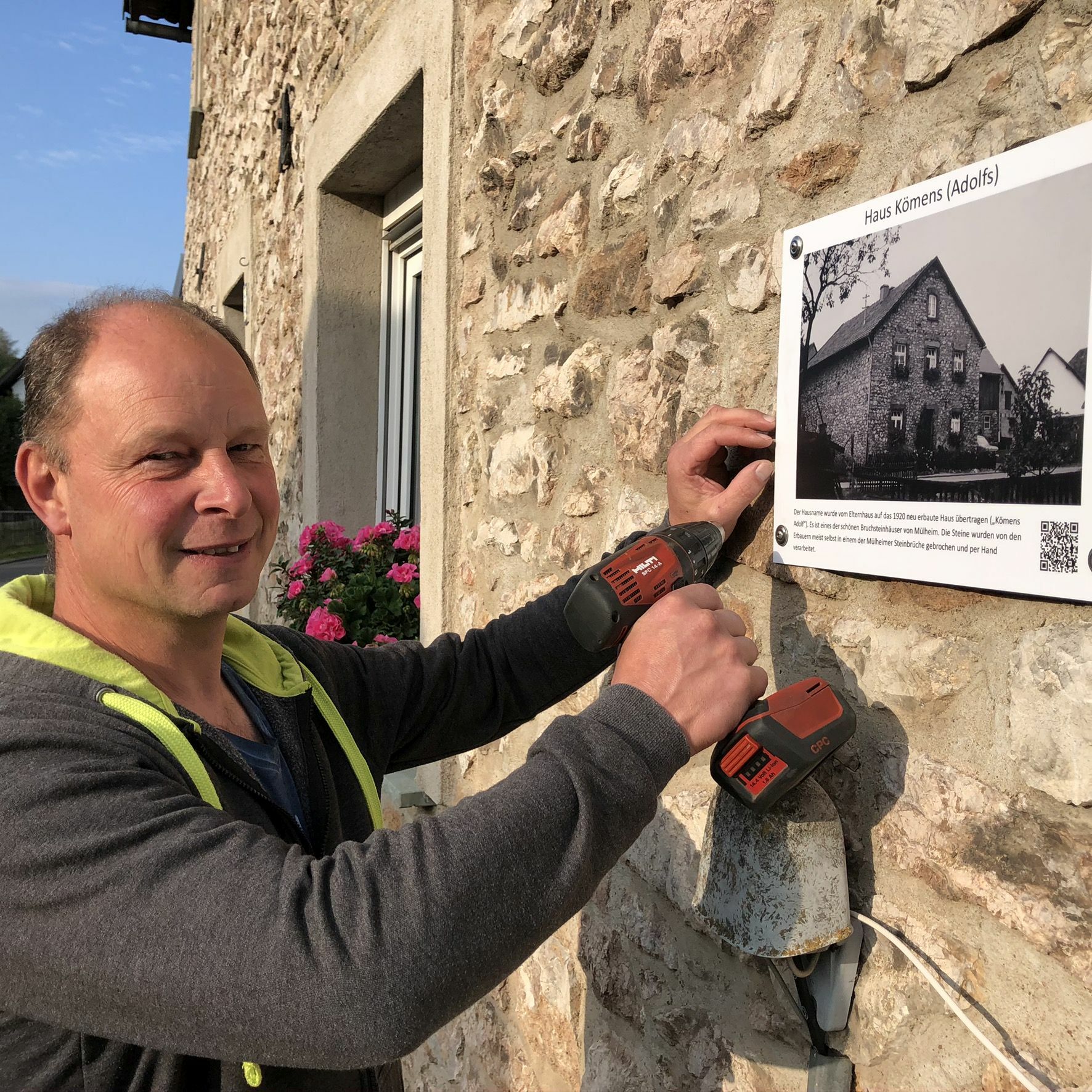 Denn auf ihnen prangt nicht nur ein Foto, sondern natürlich auch der Name des Hauses und seine Geschichte. Gedruckt sind diese Infos auf Aluminium. Für die Eigentümer der betreffenden Häuser sind keine Kosten entstanden. Für das Vorhaben gab es nach einem entsprechenden Antrag von Rainer Reetz nämlich eine Finanzierung von 2000 Euro aus dem NRW-Förderprogramm Heimat. Eigentlich sollten die Schilder im Rahmen eines kleines Dorffestes oder bei einer Bürgerversammlung übergeben werden. Doch da machte die Corona-Pandemie den Akteuren einen Strich durch die Rechnung. »Schließlich«, so Rainer Reetz, »haben wir die Schilder auf dem kleinen Dienstweg verteilt und die Besitzer haben sie selbst aufgehängt.« Dort, wo die Eigentümer aufgrund ihres Alters oder anderer Gebrechen dazu nicht in der Lage waren, griff man selbst zum Akkuschrauber und montierte die Schilder kurzerhand an.