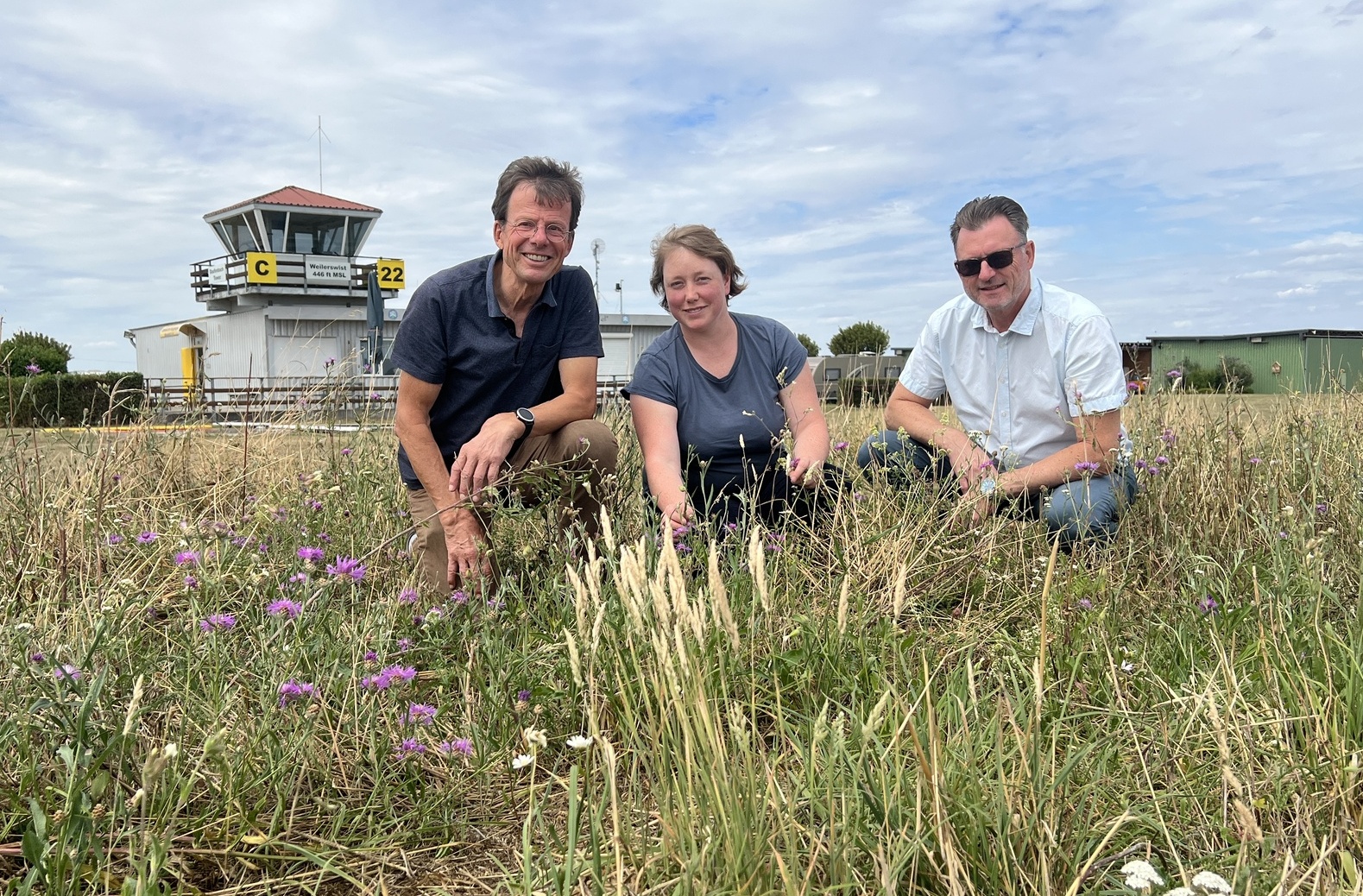 Rund sechs Hektar umfasst das Gelände, das die Ultraleicht-Fluggruppe Nordeifel etwas außerhalb von Weilerswist bewirtschaftet. Dabei wird längst nicht alles für den Flugbetrieb genutzt. »Etwa auf der Hälfte der Fläche haben wir in Kooperation mit der Biologischen Station Euskirchen Blühwiesen angelegt, die neben Bodenbrütern, wie Fasanen und Rebhühnern, Wieseln und Feldhasen auch einer Vielzahl von Insekten ein Zuhause bieten«, erklärt Stefan Heine, Vorsitzender der Ultraleicht-Fluggruppe Nordeifel.