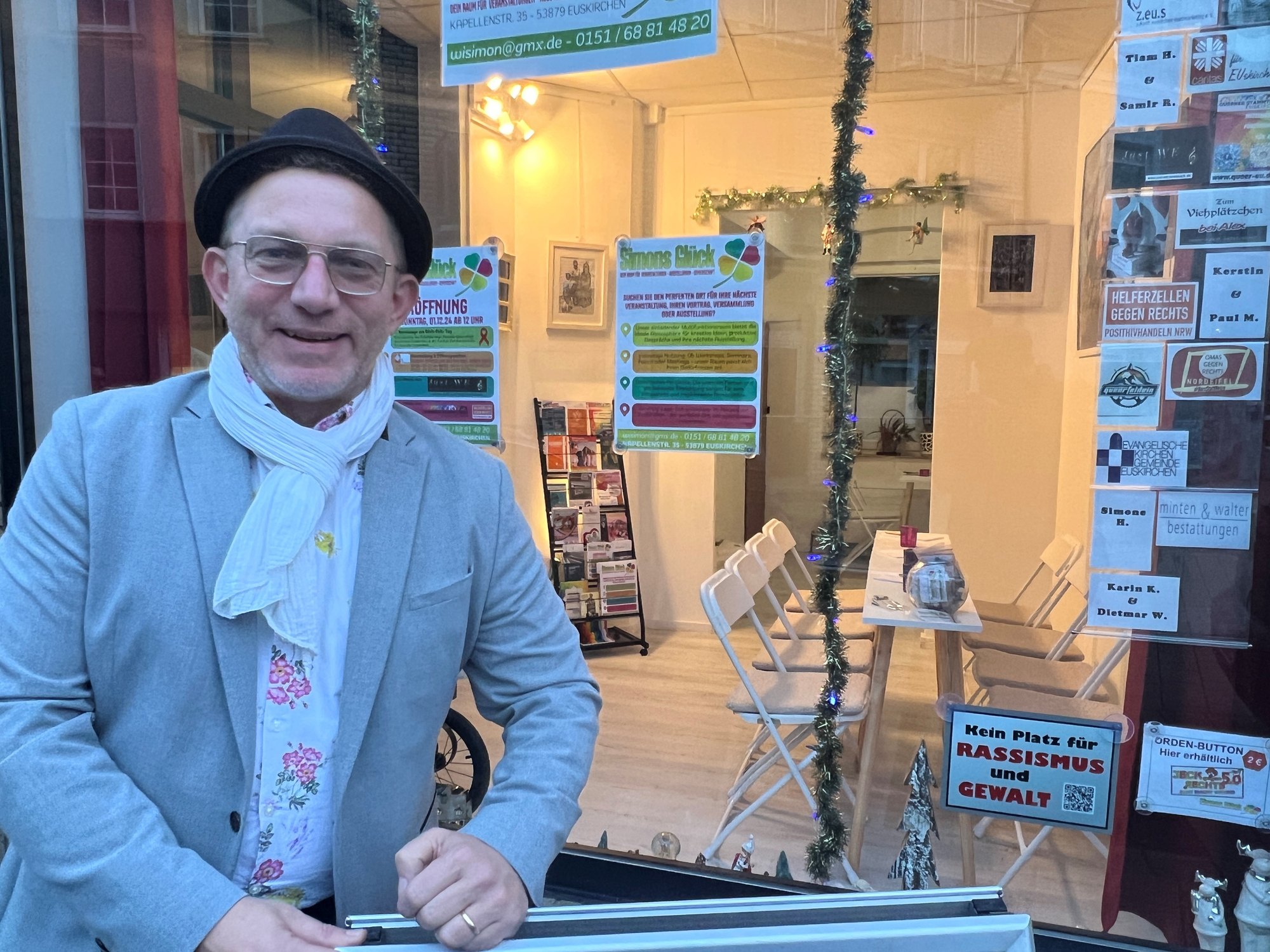 »Man könnte den Raum auch ‚Simons kleines Glück‘ nennen, denn der Raum ist nicht sonderlich riesig«, scherzt Winfried Kubitza-Simons. Dennoch hofft der Euskirchener, durch das kleine Ladenlokal in der Kapellenstraße 35 in Euskirchen Großes zu bewegen. »Simons Glück ist ein Raum für Begegnungen, Ausstellungen, Austausch, Kreativität, Bildung, Vernetzung – ein Raum, der Menschen zusammenbringt, Ideen sprießen lässt und den Zusammenhalt in unserer Stadt stärkt«, erklärt Kubitza-Simons seine Motivation, den Raum zur Verfügung zu stellen. »Mein Ziel ist es, durch positive Aktivitäten das Viertel und das sogenannte ‚Viehplätzchen‘ aufzuwerten und lebenswerter zu gestalten – und hierzu allen, die dazu beitragen möchten, einen Raum zur Verfügung zu stellen. Dabei sollen alle gesellschaftlichen Schichten mit einbezogen werden«, sagt Kubitza-Simons.