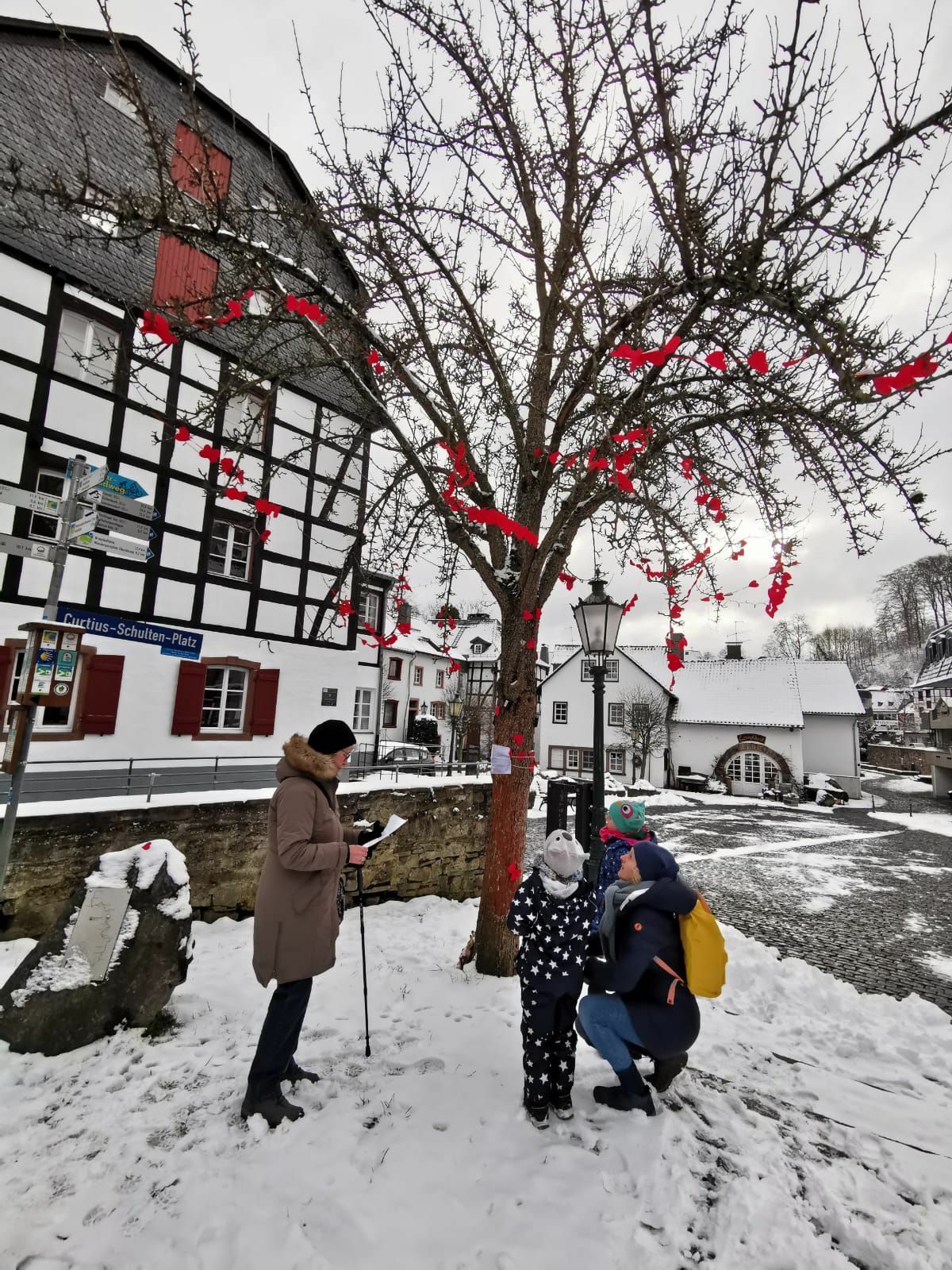 Die bekannte Märchenerzählerin Angelika Coppers, die Künstlerin Renate Katz und die »Baum-Kümmerin« Elli Olzem haben den Birnbaum bereits im Jahr 2019 zu einem Wunschbaum gemacht. Anlass war damals der »Markt lebendiger Geschichte«, der in Blankenheim zum ersten Mal stattfand. Der Wunschbaum sollte ein wenig Magie und Fantasie in den schmucken Ortskern bringen.