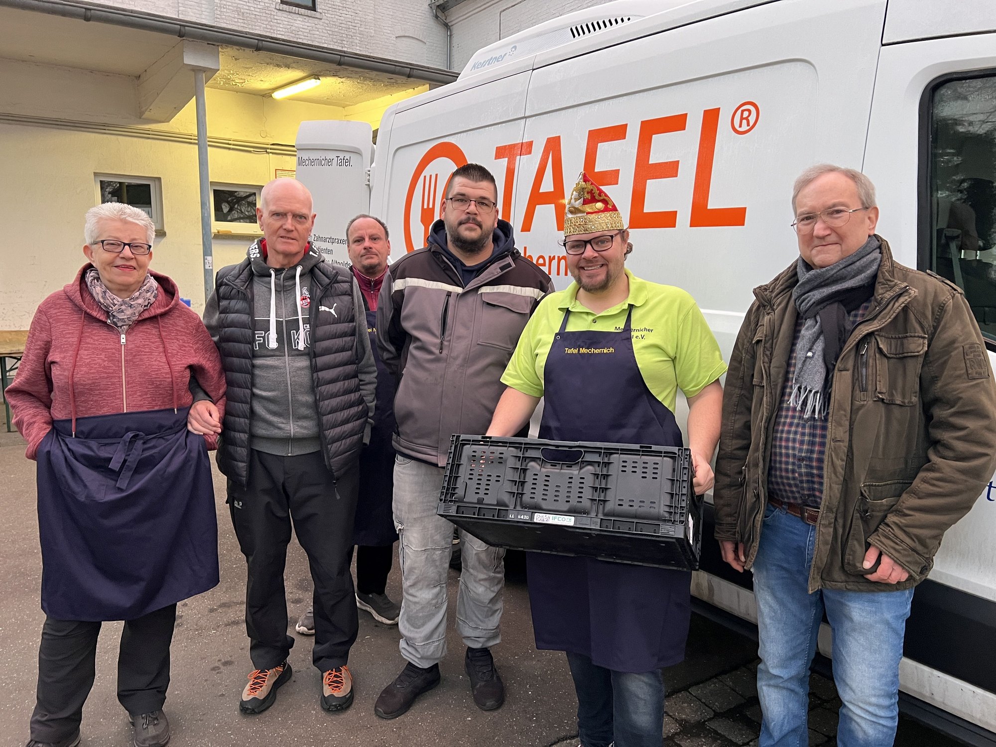 Vier Einsätze stehen in den kommenden zwei Wochen auf dem Programm – bei der Lebensmittelabholung, beim Sortieren und bei der Ausgabe an Bedürftige. Am frühen und frostigen Montagmorgen wurde die Tollität vom stellvertretenden Vorsitzenden der Mechernicher Tafel, Volker Nüßmann, und ehrenamtlichen Mitarbeitern begrüßt.