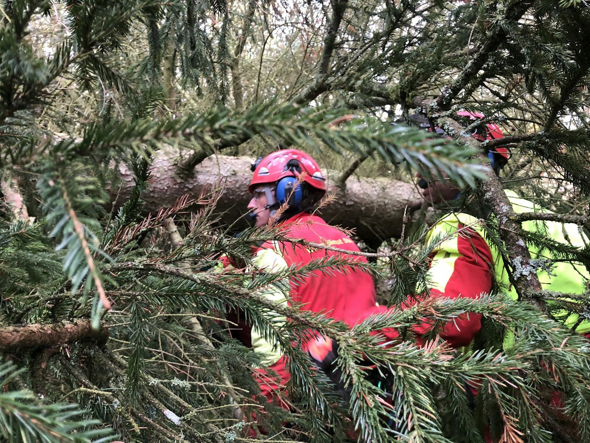 Ganz einfach war das Unternehmen nicht, denn der Platz in der Altenburger Straße war nur sehr begrenzt. Und dann galt es, den Baum mit dem Kran über das Wohnhaus von Roswitha Blum-Poensgen schweben zu lassen. Der erste Standort des Krans erwies aufgrund der aufgeweichten Rabatte als ungeeignet. Also musste eine neue Stelle gesucht werden, die rund 50 Meter vom Baum entfernt lag. Und dann ging alles sehr schnell. Mitarbeiter von Alfons Steidl kletterten in die Fichte, legten ihr im oberen Drittel die Kette um und die Motorsäge trennte sie dann schnell von ihrem angestammten Eifelboden.