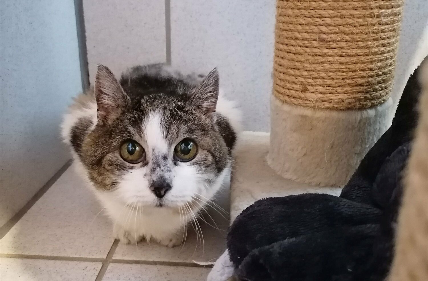 Die Katze Maggy ist mindestens 18 Jahre alt und kam vollkommen verwahrlost im Mechernicher Kreistierheim an. Ihr Fell war völlig verfilzt, weswegen sie fast komplett geschoren werden musste.