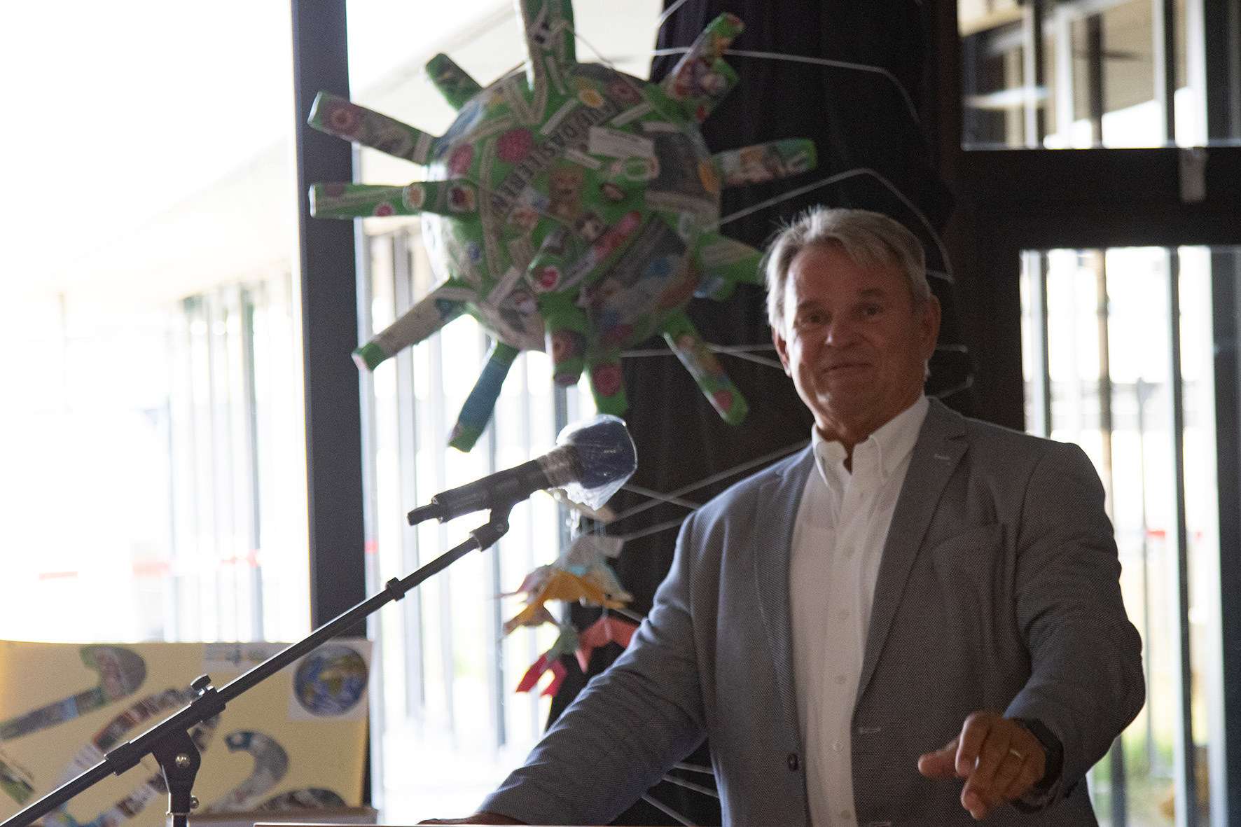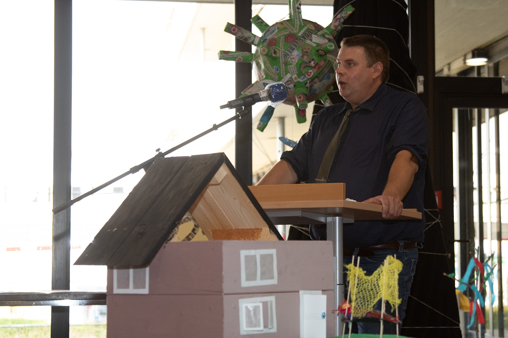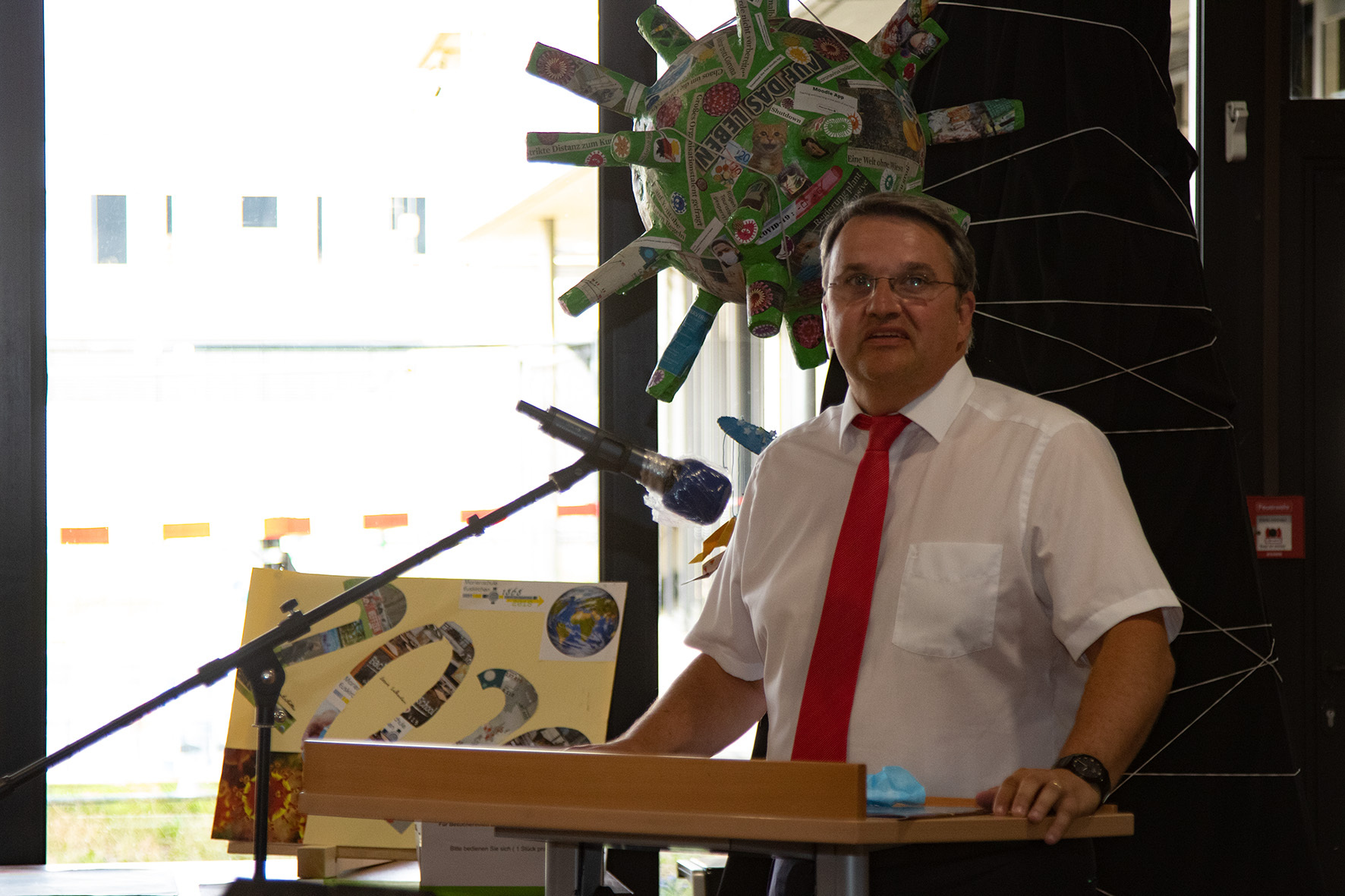 „Wer hätte am Anfang des Jahres gedacht, dass ein winziges Virus die ganze Welt in Atem hält?“. Mit diesen Worten eröffnete Günter Rosenke, Landrat Kreis Euskirchen, am vergangenen Dienstag eine Ausstellung im Kreishaus zum Thema Corona – und zwar aus Sicht von Schülerinnen und Schülern der Marienschule Euskirchen. Der Name, den die Gymnasiasten der Sammlung von rund 600 Exponaten gegeben haben, treffe voll ins Schwarze, so der Landrat: „Ver-rückte Zeiten“. Denn statt am frühen Morgen in die Schule zu kommen, mussten sich die Heranwachsenden seit März mit „Social Distancing“ abfinden, Begriffe wie „Homeoffice“ und „Homeschooling“ seien im Alltag angekommen. Rosenke: „Was die Pandemie für die Jugendlichen bedeutet, sehen wir hier auf sehr kreative und vielfältige Weise in der Ausstellung. Wer sie sich anschaut, ist bewegt. Hier werden Emotionen geweckt – man ist traurig und fröhlich, bedrückt und optimistisch. Das lässt niemanden kalt.“ Mit Texten, Collagen, Bildern, aber auch Brettspielen, Videos, Fotos und Skulpturen haben die Schüler ihren Alltag in ungewöhnlichen Zeiten reflektiert. Mal humorvoll, wie in einer Installation zum Zeitablauf vom Beginn der Schutzmaßnahmen mit geschniegelter Frisur bis zur Wuschelmähne im Lockdown, mal sachlich informativ zu Themen wie Hygiene und Masken, immer wieder auch sehr persönlich und emotional, etwa wenn es um die Themen Angst um Großeltern, Vermissen von Freunden geht. Michael Mombauer, Leiter des Mariengymnasiums, war begeistert vom Einsatz seiner Schützlinge: „Wir wollten ein emotionales Ventil in dieser schwierigen Zeit schaffen. Was die Schülerinnen und Schüler daraus gemacht haben, ist einfach toll.“ Er dankte den Jugendlichen dafür, dass sie damit einen tiefen Einblick in ihre Seele gewährt haben. Die Ausstellung kann bis zum 25. September im Foyer des Kreishauses unter den geltenden Schutzmaßnahmen besichtigt werden. Mombauer: „Ich möchte auch besonders dem Landrat, seinem Team und dem Bauhof für diese Möglichkeit und die Unterstützung danken, ebenso der Kreissparkasse Euskirchen, die uns mit der Bürgerstiftung auch hier wieder gefördert hat – ohne diese Unterstützung wären so aufwändige Projekte nicht möglich.“ Udo Becker, der Vorstandsvorsitzende der Kreissparkasse Euskirchen, betonte: „Ich bin sehr froh, dass diese außergewöhnliche Ausstellung ermöglicht werden konnte. In diesen schwierigen Zeiten zeigt sie, was geht, wo doch so vieles gerade nicht geht – auch vieles, was für das gesellschaftliche Leben so wichtig ist.“ Die Umsetzung sei „typisch Marienschule“ – eine Herausforderung sei produktiv und kreativ gemeistert worden. Becker: „In der Pandemie sind viele Dinge mittlerweile normal geworden. Ich wünsche Ihnen und mir, dass wir bald wieder zur anderen Normalität zurückkehren können.“ Das wünschte sich auch der 17-jährige Schülervertreter Yves, der aber auch die positiven Aspekte ansprach: „Obwohl wir isoliert waren, haben wir mit der Ausstellung in der Corona-Zeit etwas gemeinsam geschaffen. Schule muss mehr sein als Lernen.“ Yves und seine SV-Kollegin Anna berichteten aber auch von den Schwierigkeiten, die ohne die gewohnte schulische Infrastruktur beim Lernen zuhause aufgetreten waren, etwa wenn auch die Eltern und Geschwister von zuhause aus arbeiten und lernen mussten und dafür die Anzahl der nötigen Computer und Internetkapazität nicht ausreichte. Elisabeth hat ihre Erfahrungen in einem Märchen festgehalten. In ihrer Rede mahnte sie, in der Krise nicht den Blick für andere wichtige und drängende Themen zu verlieren, wie etwa dem Klimaschutz oder der Situation gerade für Kinder in überfüllten Flüchtlingslagern. Ihr Werk selbst beginnt mit einem fröhlichen Dorffest, das von Virenspezialist Zauberer „Cornelius Raffelzahn“ rüde und mit Hinweisen auf ein lebensgefährliches Virus unterbrochen wird. Es entspinnt sich eine Geschichte um Freundschaft, Einsamkeit, Angst und eine „Fake News“, die aber ein glückliches Ende findet. Lehrerin und Projektleiterin Marion Kleinebreil berichtete über die Entstehungsgeschichte der Ausstellung. Die war anfangs als kreative Hausaufgabe geplant. Das Kollegium war von den Ergebnissen aber so begeistert, dass schnell die Idee entstand, die Arbeiten auch der Öffentlichkeit zu präsentieren. Mittlerweile ist das Projekt sogar als Beitrag zum Jugendkulturpreis eingereicht worden. Schulleiter Mombauer bemerkte am Rand der Veranstaltung, dass sie als Lehrer einen wundervollen Beruf hätten: „Wir können Menschen wachsen sehen!“ Landrat Rosenke mahnte zur weiteren Umsicht im Umgang mit der Pandemie: „Wir haben in Deutschland und im Kreis Euskirchen die Lage vergleichsweise gut beherrschen können. Ich appelliere aber an alle, sich an die Regeln zu halten – wir haben es selbst in der Hand, wie sehr wir Abläufe umstellen müssen.“
