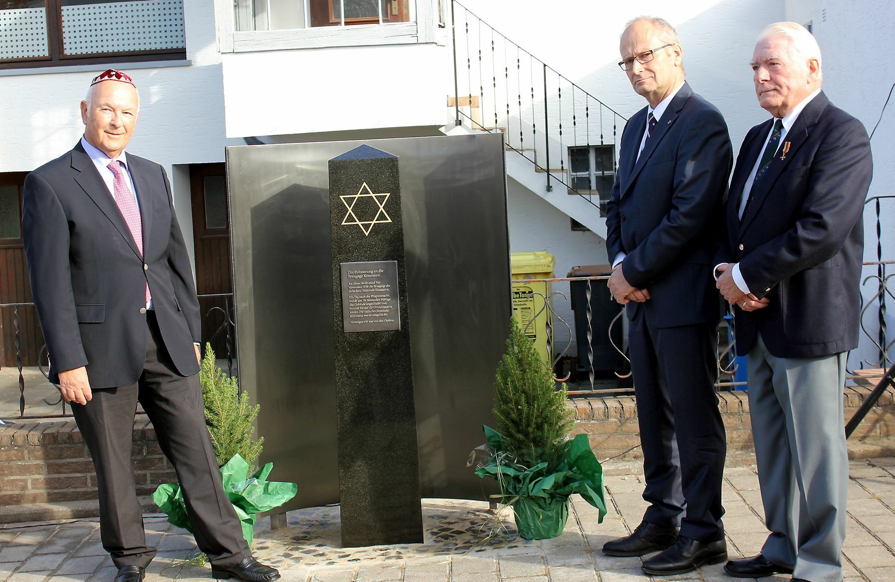 Wilfried Johnen, der frühere Geschäftsführer des Landesverbands der Jüdischen Gemeinden Nordrhein, Bürgermeister Dr. Hans-Peter Schick und der Initiator Wolfgang Abel am gerade enthüllten Mahnmal in der Kommerner Pützgasse. Es soll an die ehemalige Synagoge erinnern.