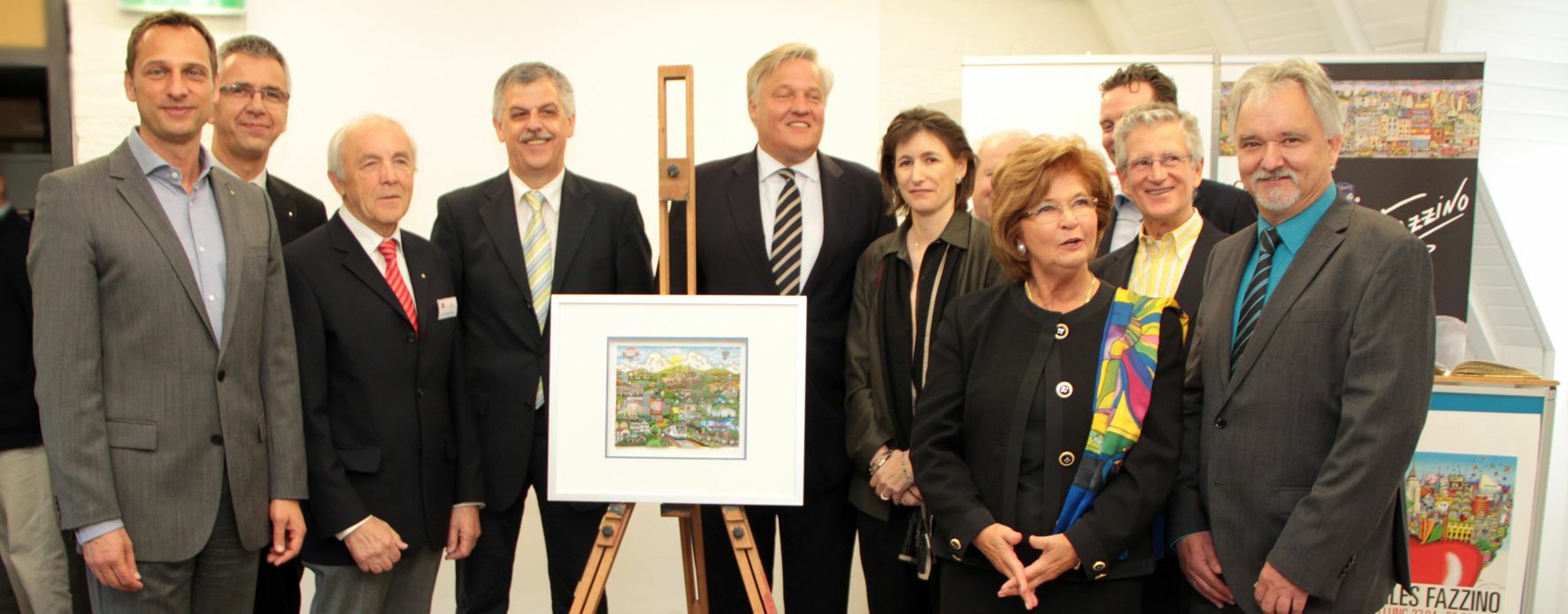 Über 150 seiner Werke sind derzeit in der ersten musealen Fazzino-Ausstellung Deutschlands auf Burg Hengebach zu sehen. Nach James Rizzi und Janosch ist dies die dritte große Ausstellung, die die Kulturinitiative im Kreis Düren auf die Beine gestellt hat. »Und sie wird sicher wieder ein Highlight für die gesamte Eifel-Region«, zeigte sich die Vorsitzende der Kulturinitiative, Katharina Rolfink, überzeugt. Mission Landrat Wolfgang Spelthahn berichtete den zahlreichen Gästen von einer besonderen Mission: Denn mit einer kleinen Abordnung hatte er vor einigen Monaten Charles Fazzino in New York besucht, um ihn für die geplante Ausstellung in Heimbach zu gewinnen, was überraschend schnell gelungen sei. Besonders in Erinnerung war dem Landrat dabei geblieben, dass er beim »Meister« höchstpersönlich eine ausgeschnittene Sonne in einem der 3D-Bilder befestigen durfte. Charles Fazzino selber konnte zur Vernissage leider nicht kommen. Er hatte aber seine engste Mitarbeiterin, Julie Manor, nach Deutschland geschickt, die eine Video-Grußbotschaft Fazzinos zeigte, in der dieser sich sehr freute, in Deutschland ausstellen zu dürfen. Julie Manor versprach jedoch, dass Charles Fazzino im Sommer auf jeden Fall nach Heimbach reisen werde. Besonders angetan sei er nämlich von dem Fazzino-Malwettbewerb für Schüler. Hier habe er sich kurzentschlossen bereit erklärt, selbst als Preisrichter zu fungieren und das beste Bild zu küren. Sondergrafik Landrat Spelthahn hielt sodann noch eine besondere Überraschung für die Anwesenden bereit: Bei seinem Besuch in New York hatte er Charles Fazzino nämlich auch Dutzende von Fotografien des Kreises Düren überbracht. Die Motive hatte der Pop-Art-Künstler als Basis benutzt, um für den Kreis Düren ein ganz besonderes Werk zu schaffen: »For the Love of Kreis Düren«, eine 3D-Sondergrafik. Viele markante Gebäude wie unter anderem die Burg Hengebach, der Indemann, das Leopold-Hoesch-Museum und auch das Jugendstil-Wasserkraftwerk sind darauf zu erkennen. Wahrer Meister »Was im Ergebnis so einfach aussieht, stellt für den Künstler eine enorme Herausforderung dar«, so Professor Zehnder, der Charles Fazzino einen »wahren Meister« nannte, wenn es darum gehe, »die Besonderheiten einer Landschaft in farbenprächtige, detailgetreue Bilder umzusetzen«. Das 20,3 mal 25,4 Zentimeter große signierte 3D-Bild wurde auf eine Stückzahl von 250 begrenzt und ist einschließlich Passepartout zum Preis von 450 Euro im Art-Shop der Burg erhältlich. »60 Exemplare sind bereits verkauft«, so der Landrat. Die Fazzino-Ausstellung auf Burg Hengebach kann noch bis zum 22. Juni besucht werden. red/epa