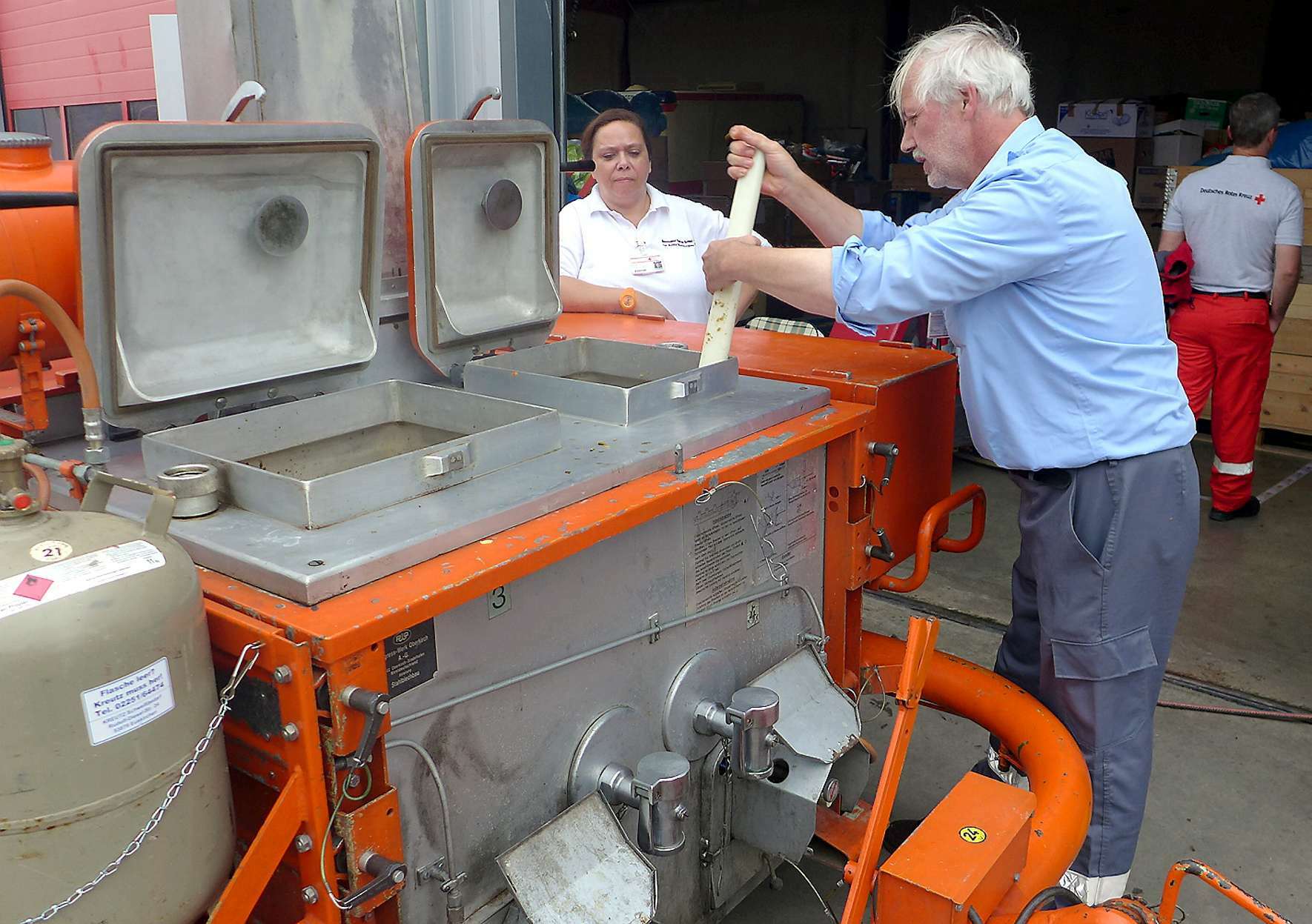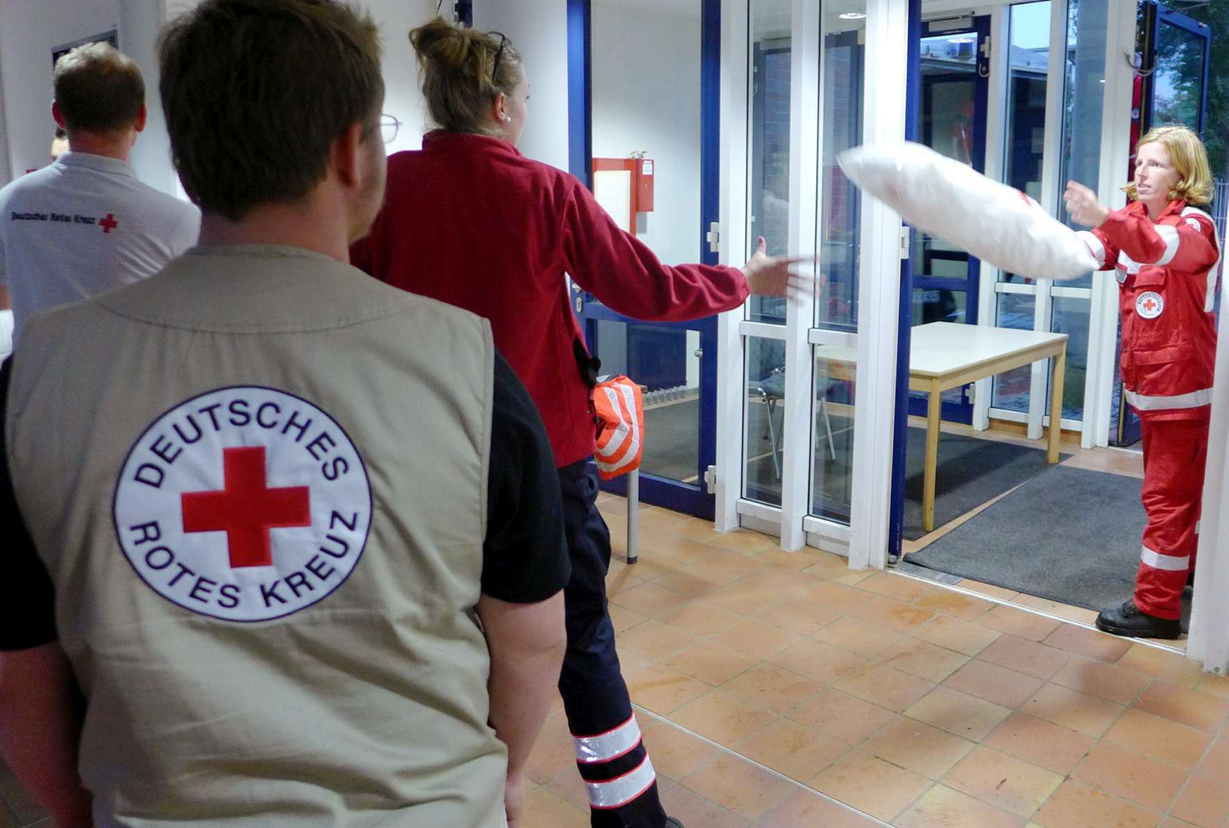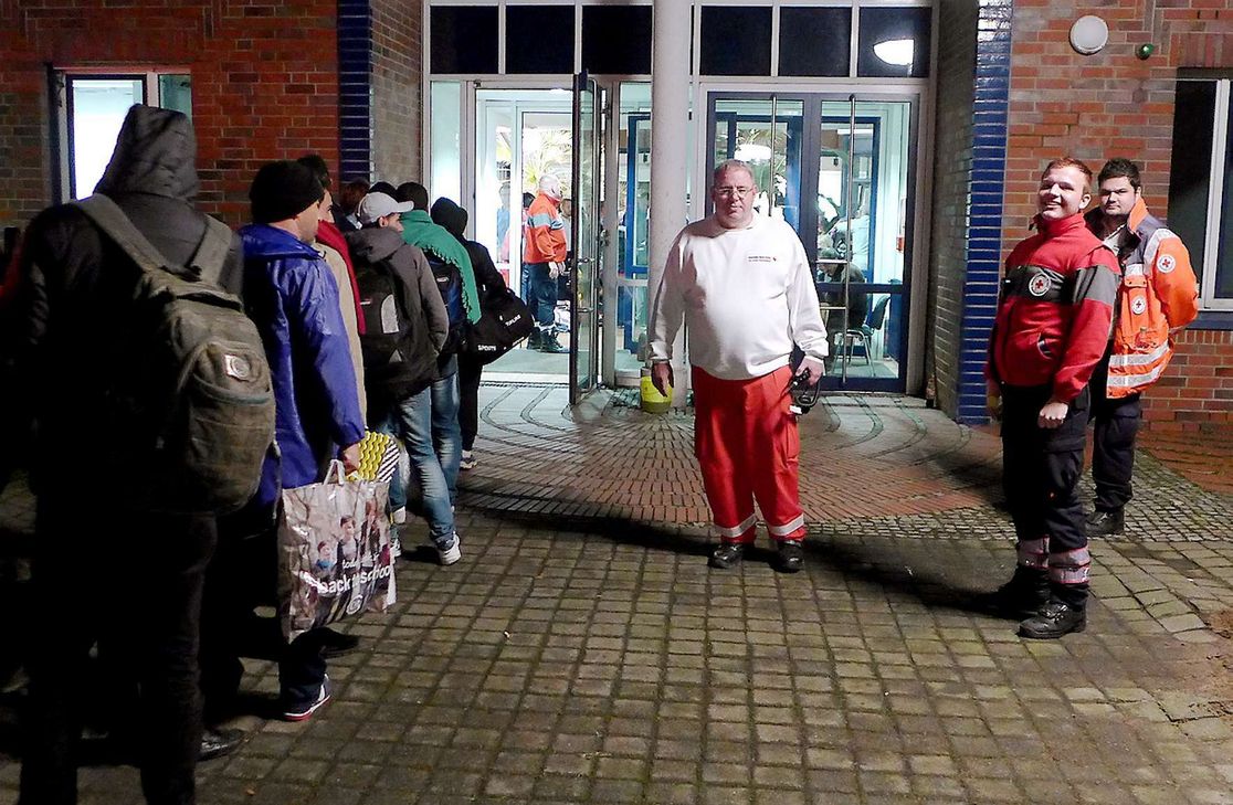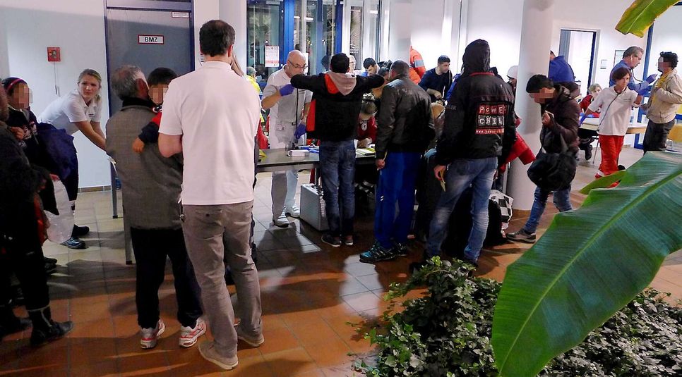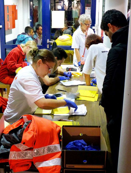 Bis Mitternacht herrschte auf den Fluren reger Betrieb. Die ehrenamtlichen Helfer des Roten Kreuzes nahmen die Menschen in Empfang, registrierten sie und brachten sie zu ihren Unterkünften in den ehemaligen Büroräumen. Sechs Rotkreuz-Ärzte überprüften die gesundheitliche Verfassung der Neuankömmlinge. „Alle Flüchtlingen waren allgemein in einem gepflegten Zustand“, so Klöcker. Das Rote Kreuz kümmerte sich auch um die Bereitstellung von Medikamenten, die einige Flüchtlinge dringend benötigten. Auch Dr. Bernhard Ziemer, der Leiter des Kreisgesundheitsamtes, war vor Ort im Einsatz.