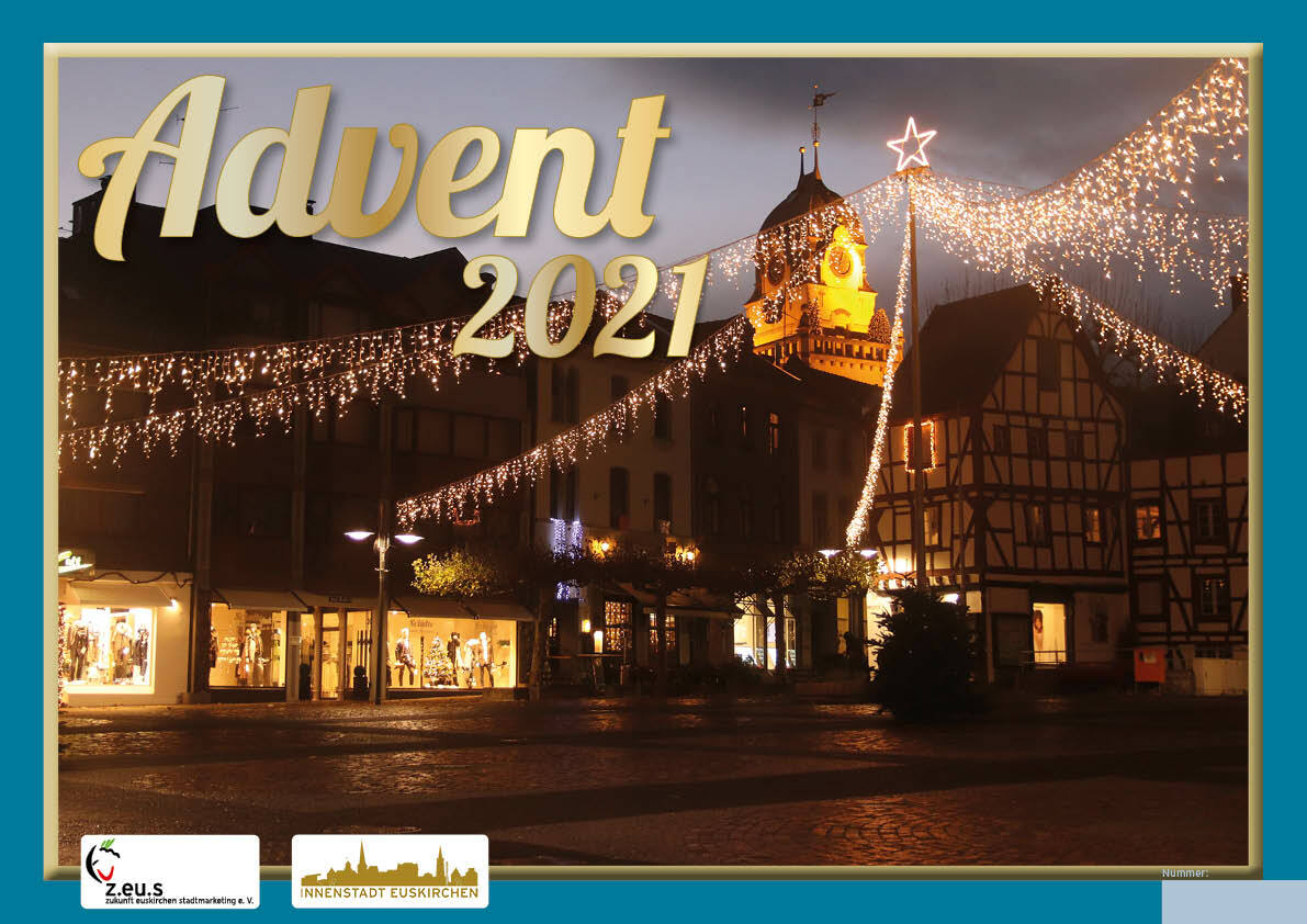 Durch den Kauf eines der 2.500 Adventskalender unterstützt jeder Käufer die Weihnachtsbeleuchtung in der Euskirchener Innenstadt. In diesem Jahr ziert wieder der Alte Markt in weihnachtlicher Atmosphäre das Titelbild. Jeder Kalender hat eine eigene Losnummer und es besteht mit dem Kauf eines Kalenders die Chance auf einen Gewinn. Die Losnummer ist jeweils auf der Vorderseite des Kalenders aufgedruckt. Es gibt Warengutscheine zahlreicher Geschäfte, Verzehrgutscheine aus verschiedenen Gastronomiebetrieben und Schecks in the City im Gesamtwert von über 2.000 Euro zu gewinnen. Der Hauptpreis wird von der Kreissparkasse Euskirchen zur Verfügung gestellt: Schecks in the City im Wert von 500 Euro. Die Auflistung der Gewinne und der Sponsoren finden Sie wie gewohnt auf der Rückseite des Kalenders.