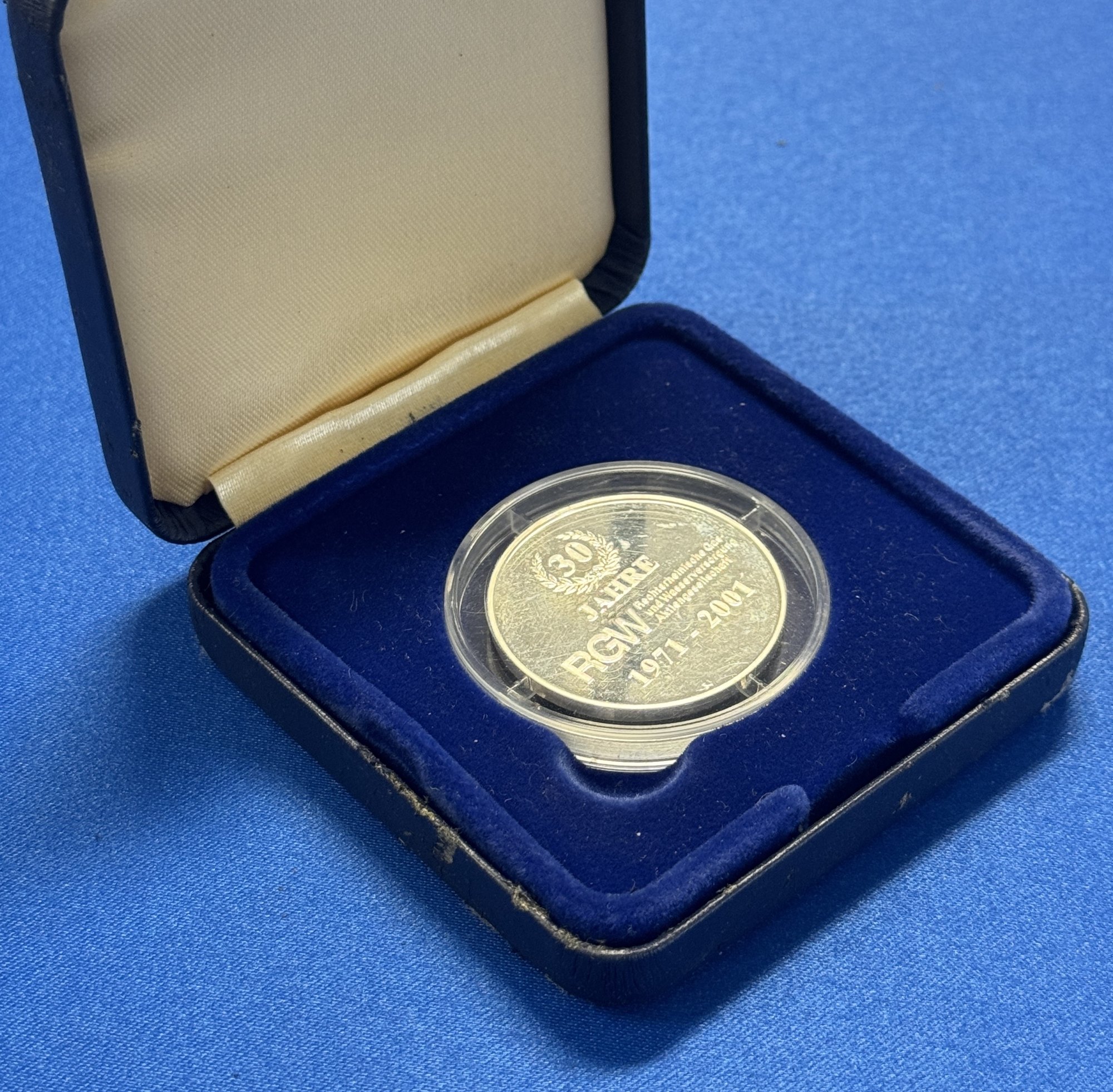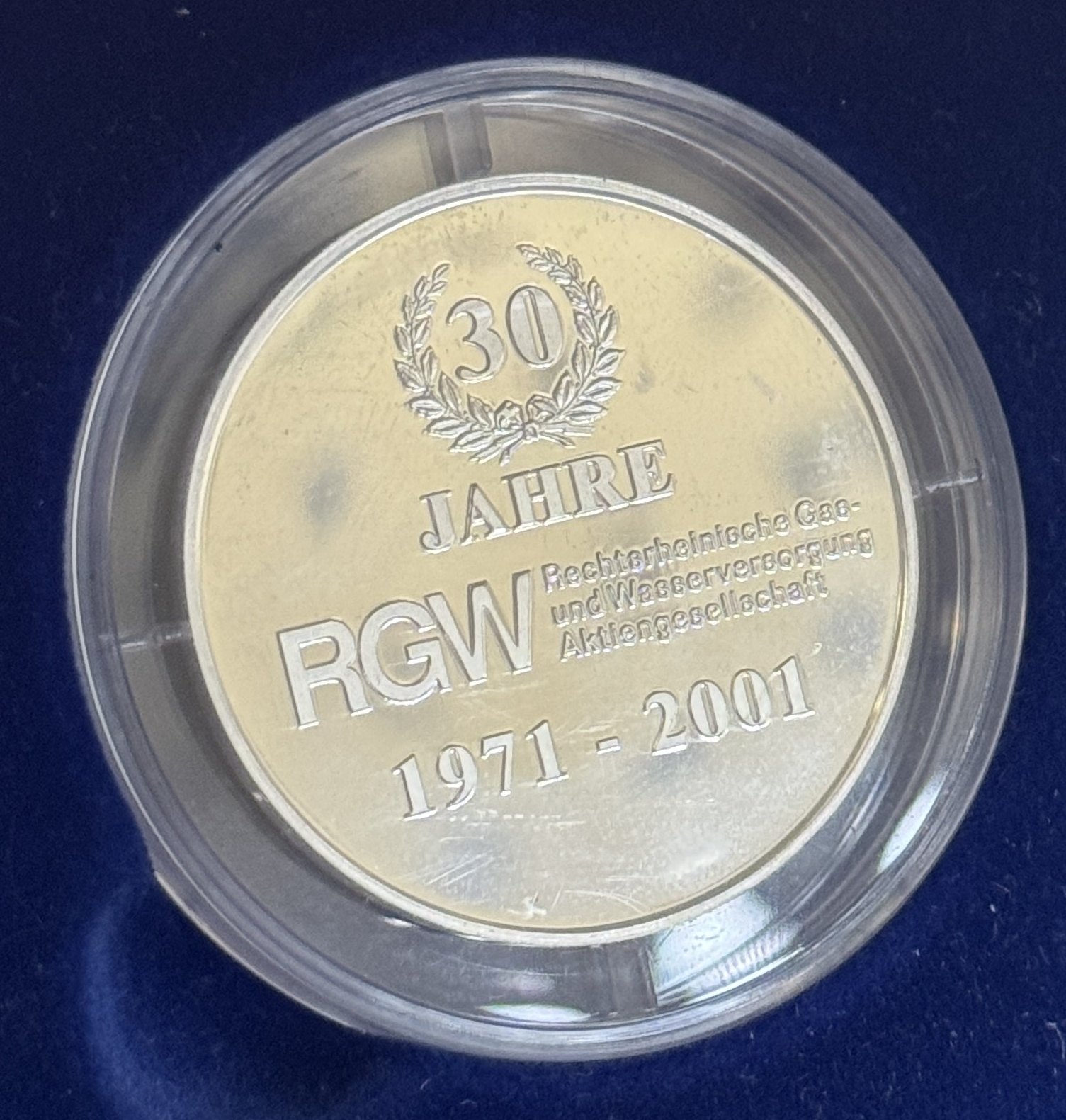 Eine Silbermünze mit der Prägung: 30 Jahre RGW 1971 - 2001 Rechtsrheinische Gas und Wasserversorgung Aktiengesellschaft;