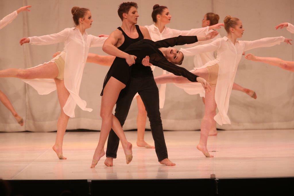Nach der erfolgreichen Wettbewerbspremiere vom letzten Jahr war die Nervosität und Anspannung hinter den Kulissen aber keineswegs geringer geworden. Ein letztes, geflüstertes 'toi toi toi' in den Bühnengassen, ein Kopfnicken, dann liefen die 13 jungen Tänzerinnen und Tänzer im Alter von 15-20 Jahren zu den einsetzenden Klängen von Peter Gabriels 'Aprés Moi' auf die Bühne: elf junge Mädchen und Frauen in langen, halbtransparenten, weißen Blusenkleidern, die Haare zu einem strengen Dutt gebunden. In einem einzigen Fluss bildeten sie immer wieder neue Formationen, wechselten nahtlos von Drehungen zu Bodenteilen zu Sprüngen, die Gesichter bewusst in einer Art ausdruckslosen Neutralität. Und mittendrin, ganz in schwarz gekleidet, Tariq Koch (19) und Daniela Möhren (20), die sich immer wieder fanden, trennten, in Hebungen und Umarmungen verschmolzen, sich in die Gruppe eingliederten und dann doch wieder herauslösten. 'Aprés moi' ist nicht nur technisch anspruchsvoll, die Choreographie von Schulleiter Robert Maytas erzählt eine Geschichte und berührt auf künstlerischer und emotionaler Ebene. Was auf der Bühne so leicht aussieht, ist das Ergebnis harter Arbeit, monatelanger Proben, und wurde am Ende zu Recht mit dem ersten Platz belohnt. Aber auch mit der energiegeladenen Hip Hop Choreographie 'Babylonia' von Margaret Macaulay-Thiel konnten die Euskirchener überzeugen und sich mit einem dritten Platz ein Ticket für den Deutschen Ballettwettbewerb in Fürstenfeldbruck sichern. Dort haben die Tänzer jetzt mit beiden Tänzen die Chance, sich für den Dance World Cup zu qualifizieren, der dieses Jahr auf der britischen Kanalinsel Jersey ausgetragen wird. Foto: Tony Maher
