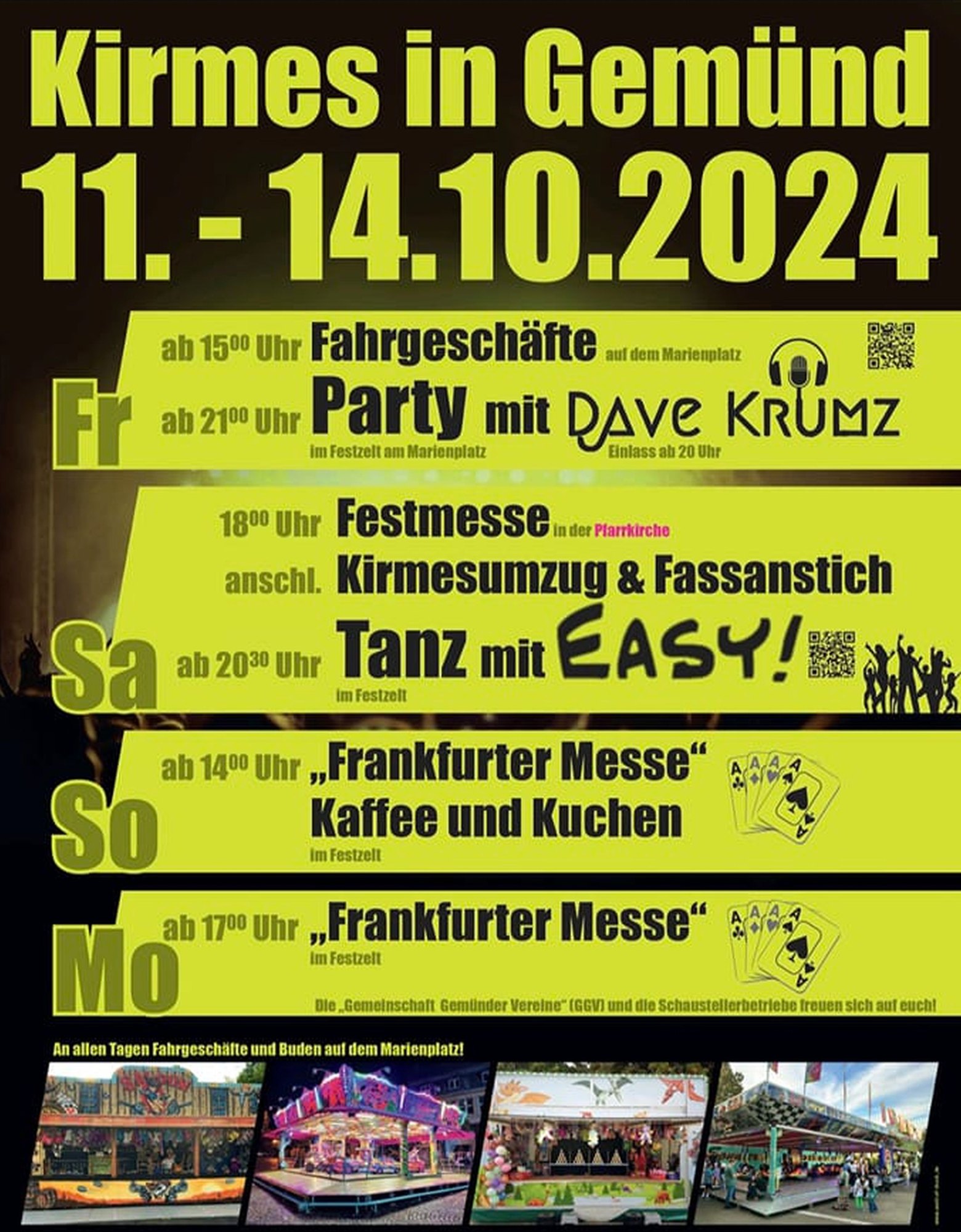 Die Gemeinschaft der Gemünder Vereine lädt von Freitag bis Montag, 11. bis 14. Oktober, zur Gemünder Kirmes ein. Am gesamten Kirmeswochenende wird ein buntes Programm angeboten. Es geht am Freitag, 11. Oktober, ab 15 Uhr auf dem Marienplatz mit dem Angebot der Fahrgeschäfte los. Es gibt Autoscooter, Schießbude, ein Kinderkarussell und eine bunten Vielfalt an Kirmesbuden. Für Essen und Trinken ist gesorgt. Ab 20 Uhr ist Einlass ins Festzelt gegenüber dem Marienplatz, wo um 21 Uhr ein Partyabend mit DJ Dave Krumz startet.