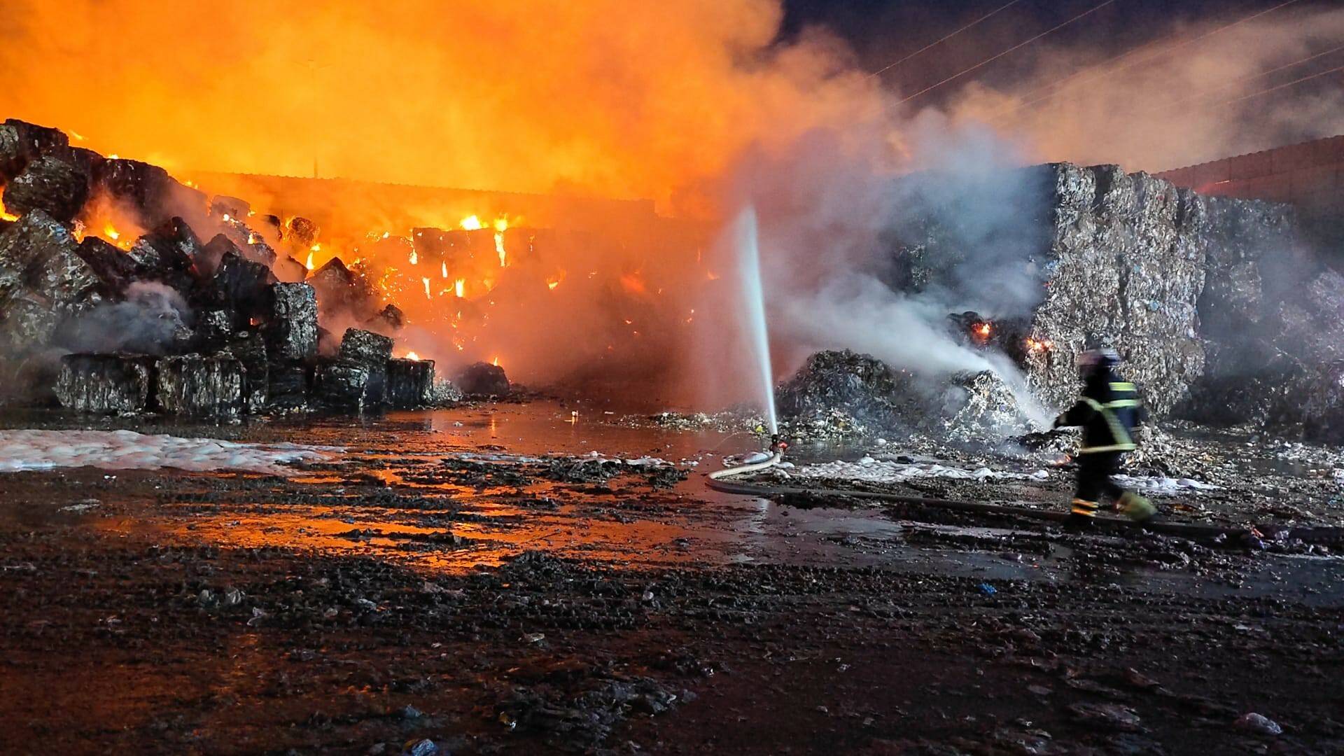Nach ersten Erkenntnissen war aus bislang ungeklärter Ursache im Bereich eines Altpapierplatzes zunächst ein kleiner Haufen mit Papierschnipseln in Brand geraten. Kurz darauf habe das Feuer auf einen großen Stapel mit Altpapier übergegriffen und sich dann auf rund 8.000 Papierballen, von denen jeder einzelne rund 900 Kilo wiegt, ausgeweitet.