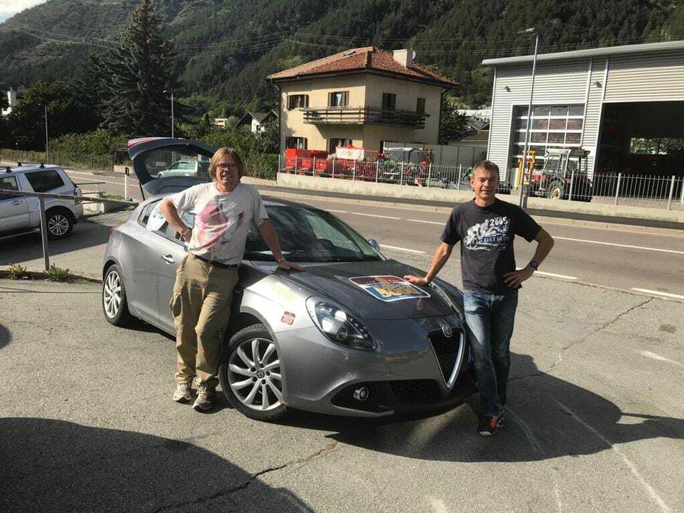 „Auf halber Höhe zum Stilfser Joch (2750 Meter) verlor unser Explorer langsam an Leistung. Ab 2000 Metern Höhe war es mit der Kraftübertragung auf das Automatikgetriebe vorbei und in 28. Kehre blieb unser Auto dann stehen und spukte nur noch einen großen Flecken Öl auf die Straße“, schreiben Ede Hanf und Gregor Scheld, die sich eigentlich auf eine 5000 Kilometer lange Tour durch Europa machen wollten. Die Tour hatte am Samstag, 8. September, gegen 12 Uhr in Aschau am Chiemsee begonnen. Dort war man mit rund 160 Teams gestartet, wovon die Hälfte nur vier Tage bis Monaco mitfährt. Es ging gleich über die österreichische Grenze Richtung Innsbruck und weiter zum Timmelsjoch auf eine Höhe von rund 2300 Metern. „Lief alles bestens“, so Gregor Scheld. Bis zur Entscheidung, zum Abschluss des Tages noch über den zweihöchsten Pass Europas, das Stilfser Joch zu fahren … Da stand er dann, der Ford Explorer: Mit Hilfe von vorbeikommenden Leute schob man das rund zwei Tonnen schwere Gefährt in eine Schotterbucht und den ADAC an. Gregor Scheld: „Nach einer Stunde kam ein sehr freundlicher junger Mann mit einem Abschleppwagen und buxierte uns von 2000 Meter Höhe wieder ins Tal auf 900 Meter. In Schluderns fanden wir dann zur späten Stunde noch eine Unterkunft. Und da sonntags keine Betriebe offen haben, legten wir einen Wandertag bei bestem Wetter ein.“ Montag früh, 10. September, ging es dann mit der Regionalbahn nach Eyrs zur Werkstatt von Herbert Egger, dessen Schwiegersohn das Team Sleyda abgeschleppt hatte. Dort erfuhr man, dass der Ford Explorer - US- Fabrikat und ziemlich alt - vor Ort nicht zu reparieren ist. Ede Hanf und Gregor Scheld: „Nun hatten wir zwischen mehreren Optionen zu wählen: Tour abbrechen und mit Zug oder Leihwagen zurück in die Heimat oder mit einem Ersatzfahrzeug weiter machen.“ Das Team entschied sich für die letzte Variante, „denn Aufgeben ist nicht unsere Stärke“. Nach langen Recherchen fand man einen Autovermieter in Meran, bei dem sie für 11 Tage einen Gelände-Jeep online buchten, den sie anschließend in Mechernich wieder abgegeben können. In Meran per Bahn angekommen, entpuppte sich der Jeep als Alfa Romeo Julietta bzw. Fiat Panda. Eine andere gab es nicht. „Also nahmen wir den Alfa“, schreiben beide, fuhren zurück nach Eyrs zur Werkstatt und packte um. Einige Sachen verblieben im Ford. Der Büffelschädel ging als Dankeschön an die Autowerkstatt. Am Dienstag, 11. September, ging es wieder auf die Strecke – noch einmal hoch zum Stilfser Joch, weiter nach San Bernhardino, vorbei am Lago Magiore hinein ins Piemont und schließlich bis ins Aortatal auf einen Campingplatz. „Heute geht es vorbei am Mont Blanc nach Frankreich in die Alpen“ schreiben beide am frühen Mittwochmorgen, 12. September. „Die Stimmung ist immer oben auf, alle Begegnungen sind geprägt von Herzlichkeit.“
