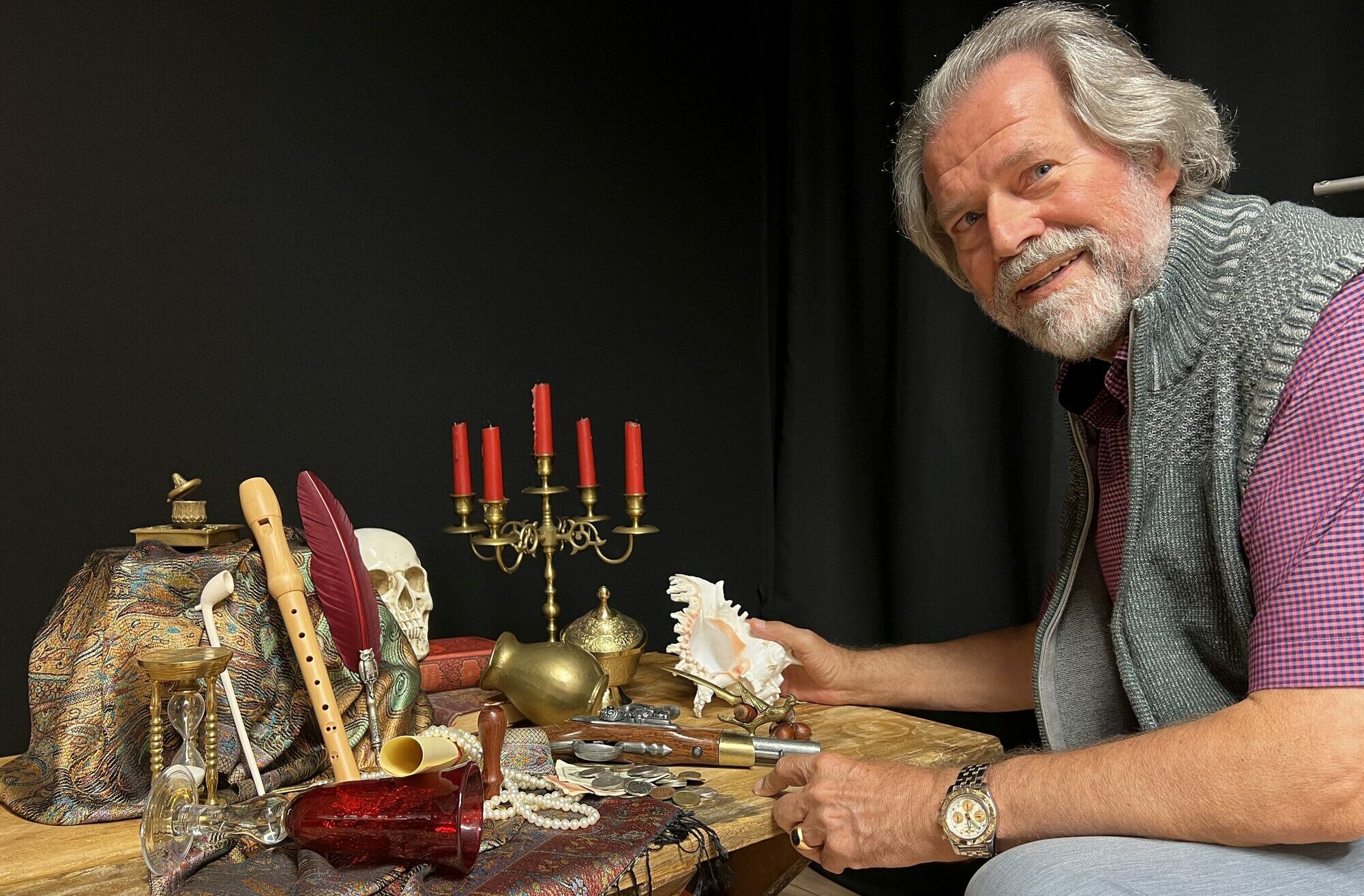 Doch zurück zu seiner Leidenschaft, die das Ehepaar Usadel bei einem Berufsstand besonders beliebt macht - den Trödlern. Denn für die Utensilien, die jede für sich einen bestimmten Symbolwert haben, muss er sich auf die Suche begeben. Und so stapeln sich im Souterrain nicht nur Scheinwerfer, Hintergründe und fototechnisches Equipment, sondern auch Totenköpfe, Pfeifen, Kerzenständer, Federn, Tücher, Ketten, Hüte, antiquarische Bücher, Flöten, Siegel, Muscheln und vieles mehr.