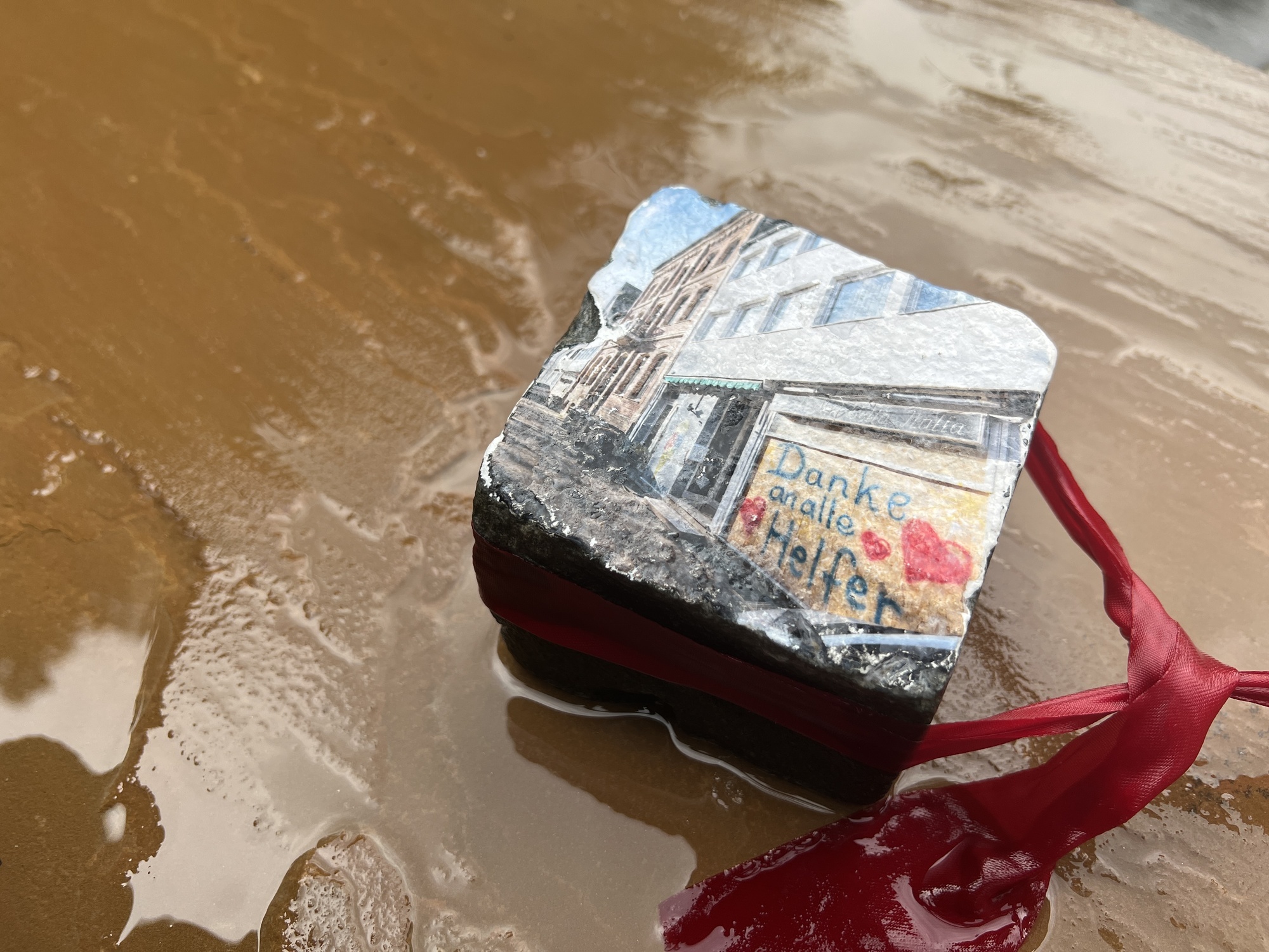 Ein besonderes Element der Treppe sind die alten Pflastersteine, die in das Bauwerk integriert sind, und Motive der Flut aus Bad Münstereifel tragen. Diese »Foto-Pflastersteine« hat der Fotograf Joachim Rieger in einem aufwendigen und hoch-wertigen Druck gestaltet. Privatleute und Unternehmen haben die Steine gestiftet.