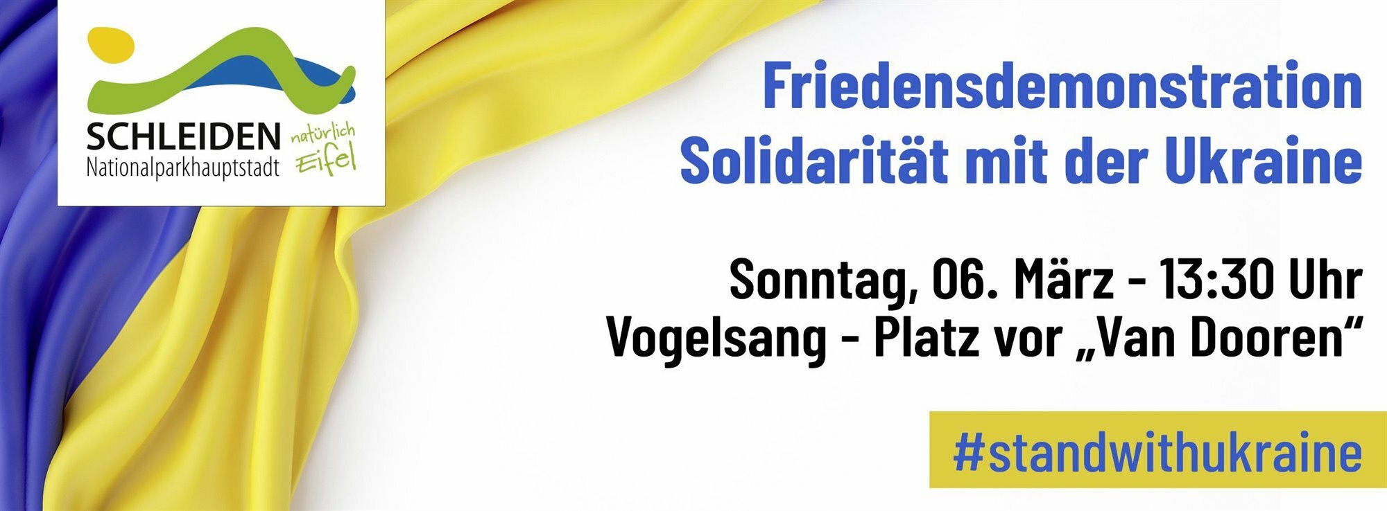 Am Sonntag, 6. März, lädt die Stadt Schleiden um 13.30 Uhr zu einer zentralen Friedensdemonstration in Vogelsang auf dem Platz vor „Van Dooren“ unter dem Motto „Solidarität mit der Ukraine“ ein.