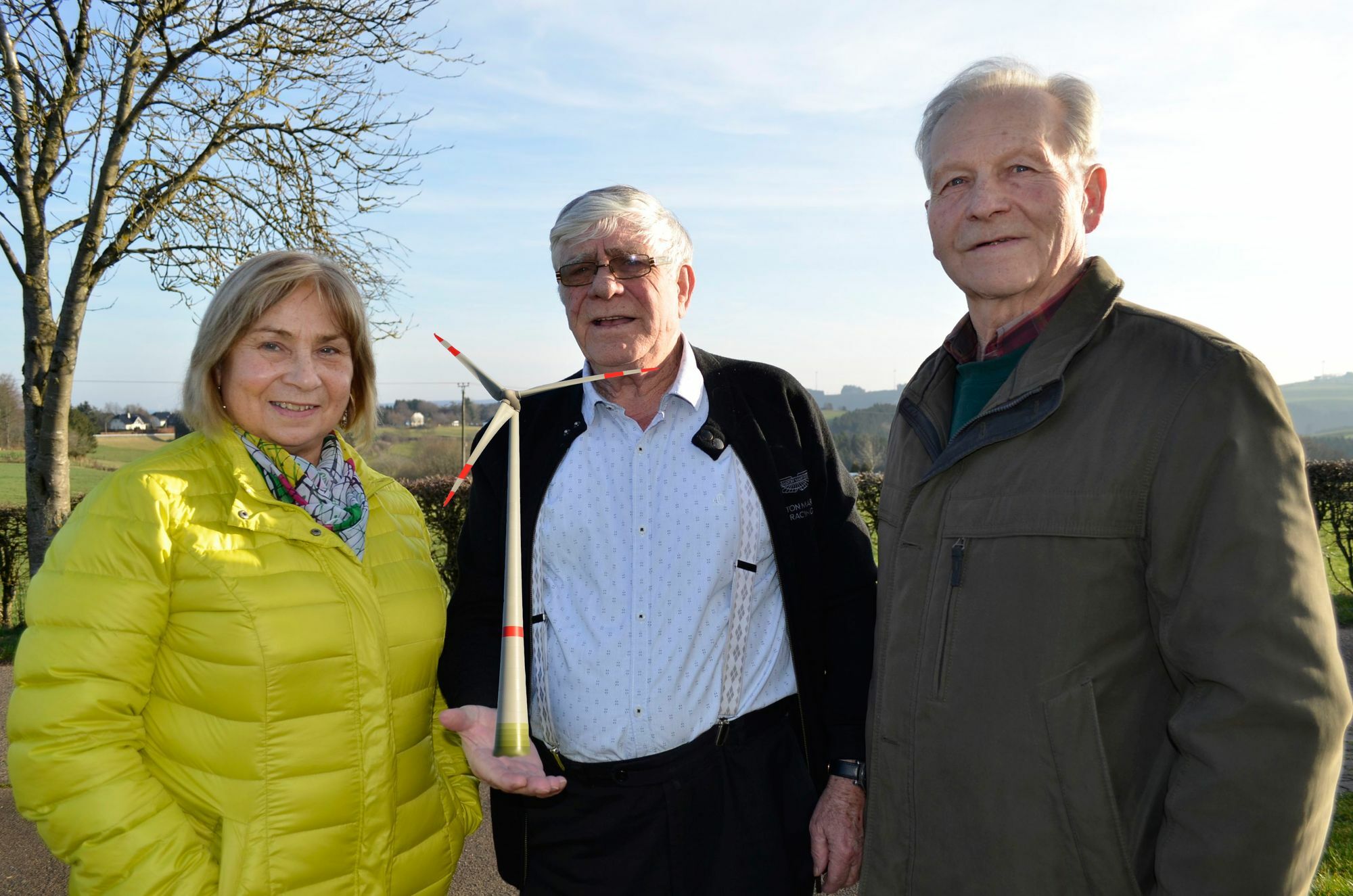 »Uns ist bewusst«, sagt Peter Molitor, »dass solche Windräder das Landschaftsbild verändern.« Wer keine Kohlekraftwerke oder marode Atommeiler wie im benachbarten Belgien wolle, der müsse zwangsläufig erneuerbare Energien zulassen und fördern. Und solche Anlagen machen halt nur da Sinn, wo es auch ordentlich Wind gibt. »Auch wir können unsere Windräder nicht verstecken«, so die Meinung der sechs Grundstückseigentümer. Allerdings seien die Anlagen so gelegen, dass Nachteile durch Schallemissionen oder Schattenwurf für die Bürger nicht zu befürchten seien. Und dann bitten die drei Sprecher vor die Türe und zeigen auf die zahlreichen Windkraftanlagen, die rund um Hollerath zu sehen sind. »Diese Anlagen«, so Peter Molitor, »sind viel störender, als es der eigene Windpark sein wird.«